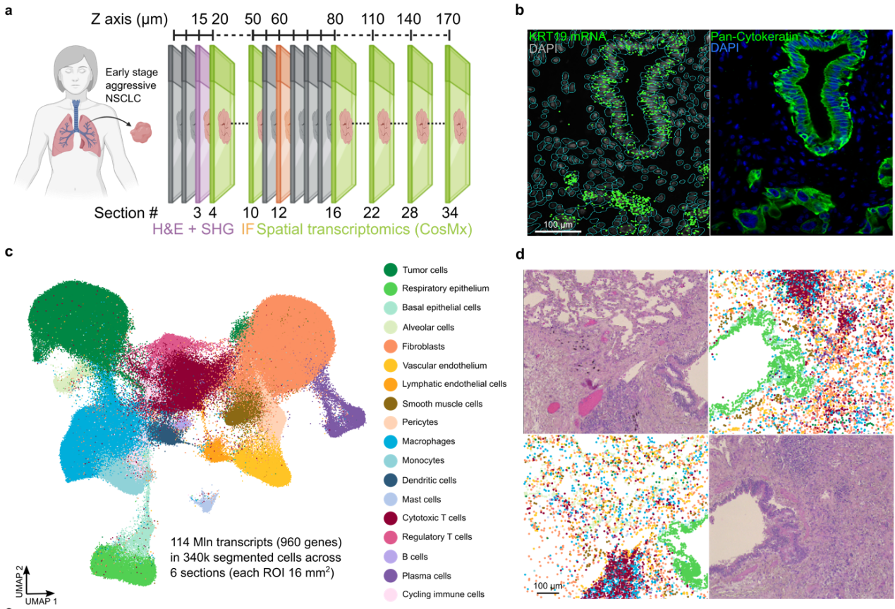 取樣策略:非小細胞肺癌(NSCLC)腫瘤塊連續(xù)切下34個5 μm切片:分別進行二次諧波SHG成像、H&E染色、空間轉錄組(1000 Panel CosMx空間分子成像系統(tǒng))該研究展示了侵襲性人肺癌常規(guī)臨床樣本的3D空間圖譜,通過將跨340,000個細胞的960個癌癥相關基因的原位定量與組織力學成分的測量相結合,三維細胞鄰域?qū)⒛[瘤微環(huán)境細分為腫瘤、基質(zhì)和免疫多細胞生態(tài)位。有趣的是,偽時間分析表明,在基質(zhì)浸潤性腫瘤細胞中檢測到的促侵襲性上皮細胞向間充質(zhì)細胞轉化(EMT)已經(jīng)發(fā)生在腫瘤表面的一個區(qū)域。在那里,肌成纖維細胞和巨噬細胞特異性地與侵襲前腫瘤細胞共定位,它們的多細胞分子特征確定了生存時間較短的患者。與2D相比,3D鄰域通過識別樹突狀生態(tài)位,捕捉T細胞生態(tài)位的3D擴展和促進生態(tài)位特異性細胞-細胞相互作用的量化(包括可藥物免疫檢查點),改善了免疫生態(tài)位的表征。