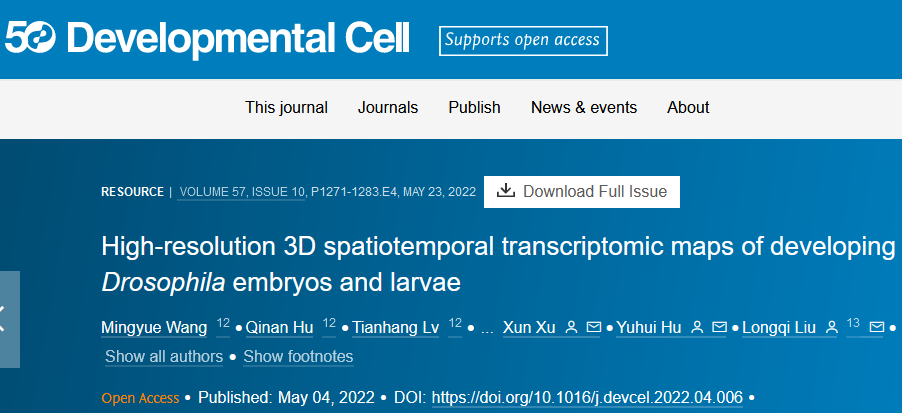 英文標題:High-resolution 3D spatiotemporal transcriptomic maps of developing Drosophila embryos and larvae