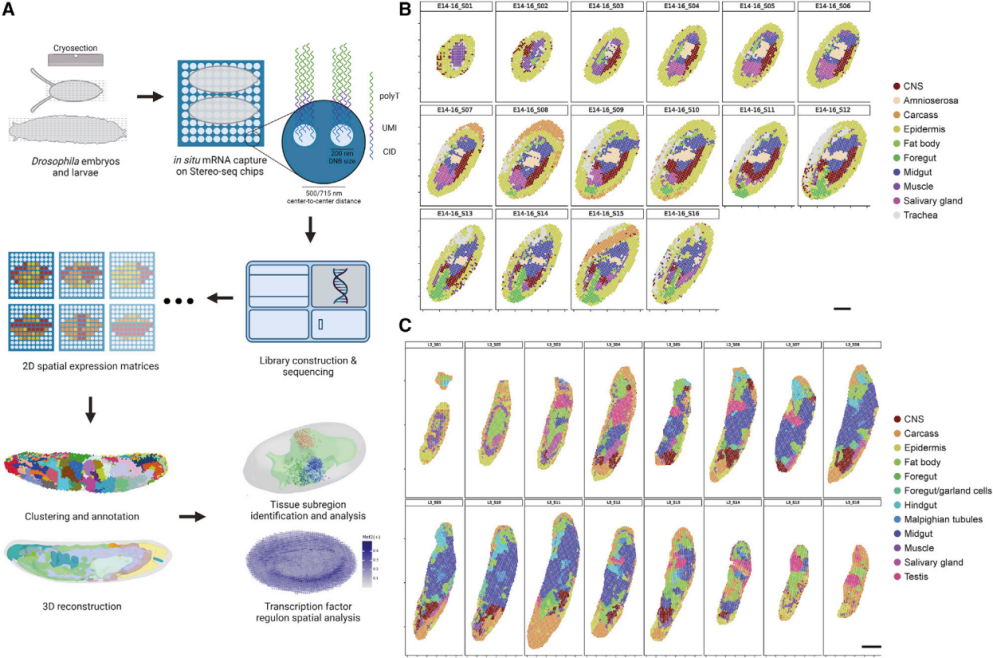 利用時空組學技術成功構建了果蠅胚胎和幼蟲的三維空間轉錄組圖譜。借助數(shù)據(jù)三維重構,確定了果蠅晚期胚胎和幼蟲中腸的功能亞區(qū),發(fā)現(xiàn)幼蟲精巢的時空細胞狀態(tài)動力學變化,并揭示了已知和潛在的轉錄因子在三維空間中的調(diào)控機制。這些研究和發(fā)現(xiàn)提供了全面詳實的數(shù)據(jù)和信息資源,為深入和系統(tǒng)進行果蠅發(fā)育生物學研究奠定基礎。