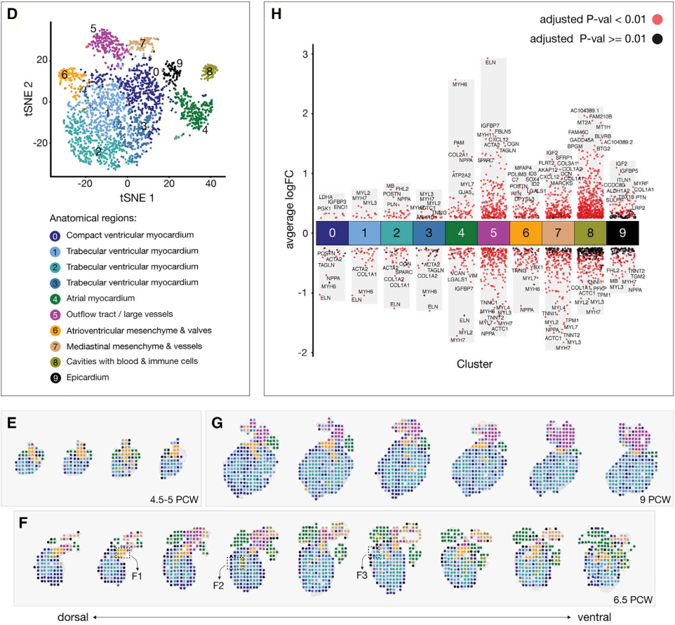 取樣策略:4.5-5 PCW 4張切片,6.5 PCW 9張切片,9 PCW 6張切片,合計19張切片文章構建了單細胞時空水平的發(fā)育中器官的3D轉錄圖譜,這種多轉錄組測序方法可以應用于其他器官發(fā)育的研究中。這一突破性研究使探索組織的整體空間轉錄模式成為可能,探索細胞異質(zhì)性,并選擇性地靶向一些表達模式具有空間異質(zhì)性且造成細胞類型差異的關鍵基因。心臟發(fā)育模型表明,空間、時間信息與單細胞基因表達數(shù)據(jù)的整合對于識別細胞類型之間的關鍵差異、深入分析發(fā)育中的組織是至關重要的。