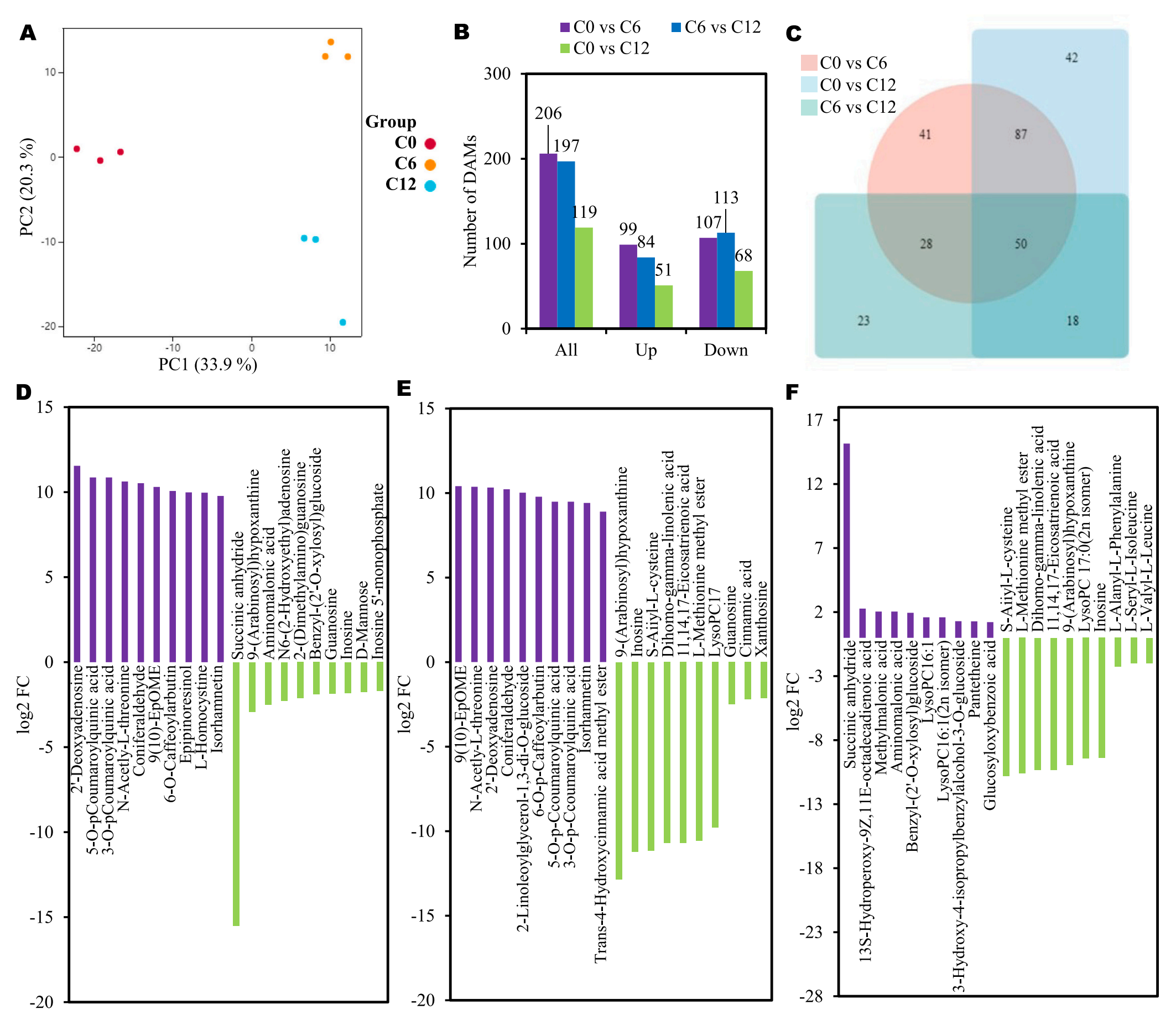 韋恩圖分析評估每個差異分組特有和共有的DAMs (圖2C)。圖2D-F展示了每個比較組中豐度增加和減少的top20的DAMs。C6組中10個代謝物豐度升高,如2′-脫氧腺苷、3-O-對香豆酰奎寧酸、n -乙酰- l -蘇氨酸、松柏醛、9(10)-EpOME、6-O-咖啡酰丁醇、表肌醇、l -同型半胱氨酸、5-O-對香豆??鼘幩?、異鼠李素。相反,琥珀酸酐、9-(阿拉伯糖基)次黃嘌呤、氨基丙酸、N6-(2-羥乙基)腺苷、2-(二甲氨基)鳥苷、芐基-(2 ‘-O-木糖基)葡萄糖苷、鳥苷、肌苷、D-甘露糖和肌苷5 ‘ -單磷酸在C6組中的豐度較低(圖2D)。