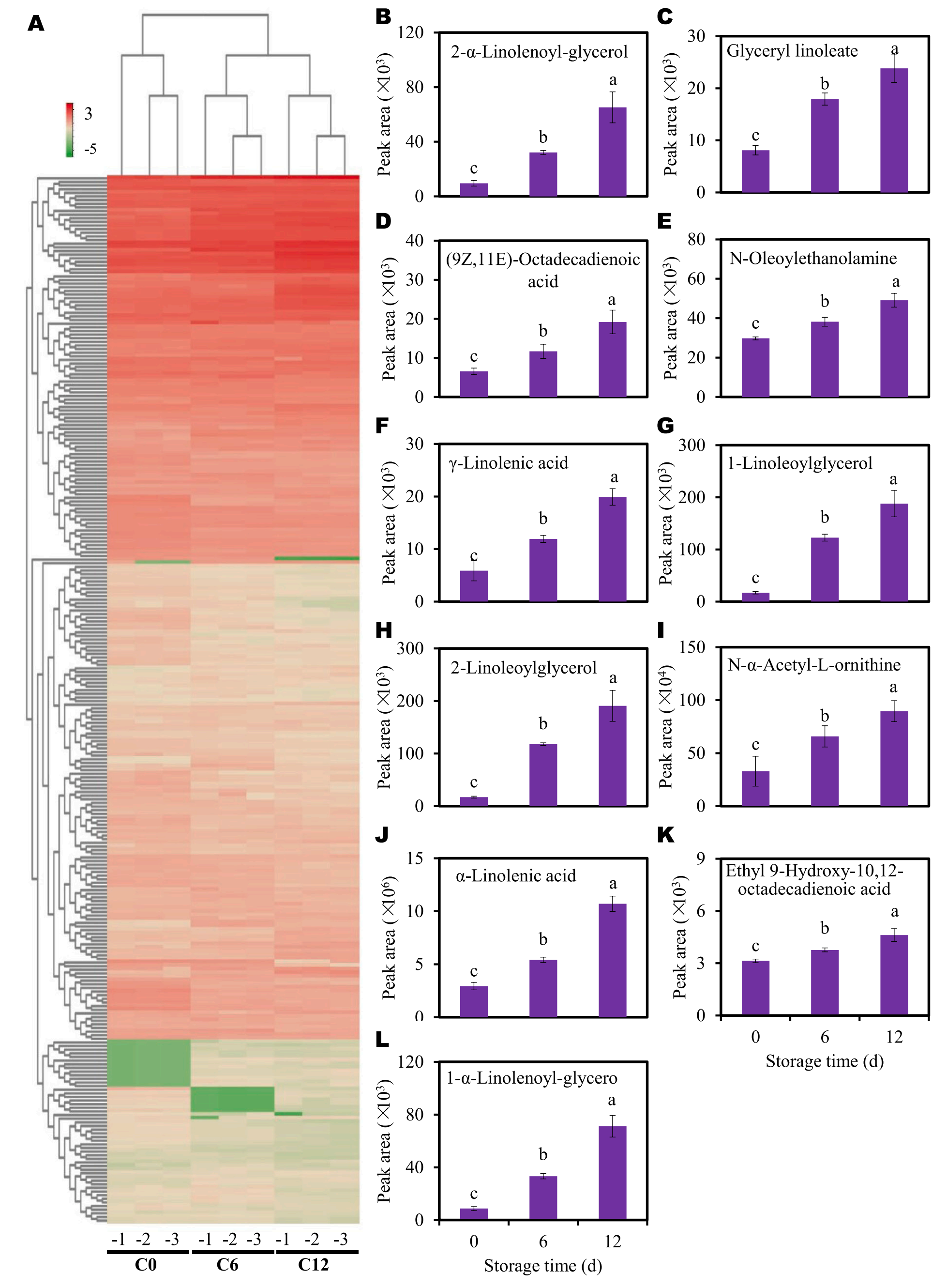 在C0和C12中,9(10)- epOME、n -乙酰- L-蘇氨酸、2 ‘ -脫氧腺苷、5- O -對香豆?;鼘幩?、2-亞麻油基甘油-1,3-二- O -糖苷、松木醛、6- O -對咖啡?;芄?、異鼠李素、3-O-對香豆?;鼘幩岷头词?4-羥基肉桂酸甲酯在C12組中含量較高。相反,9-(阿拉伯糖基)次黃嘌呤、肌苷、S – aiiyl -L -半胱氨酸、8,11,14-二十烷三烯酸甲酯、L-蛋氨酸甲酯、LysoPC17:0、鳥苷、肉桂酸、11、14、17-二十碳三烯酸和黃嘌呤在C0組中表現(xiàn)出更高的豐度(圖2F)。