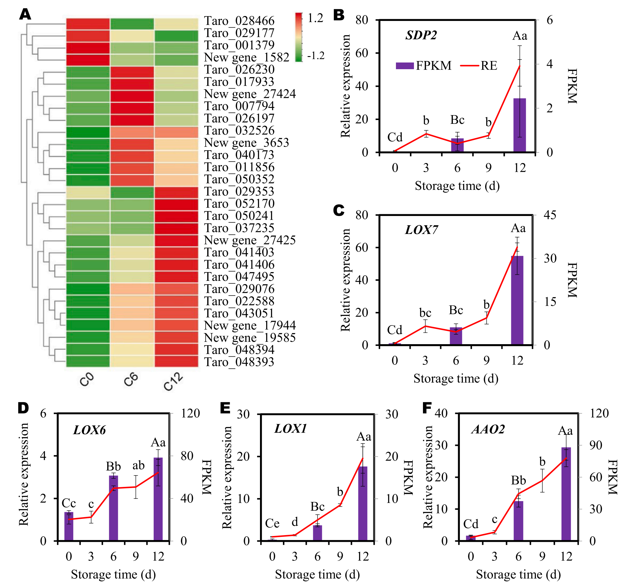 為了驗證RNA-seq數(shù)據(jù)的質(zhì)量,研究檢測了亞麻酸代謝途徑中DEGs的表達模式。在切片芋頭褐變過程中,該途徑中的DEGs差異表達(圖6A)。在這些基因中,4個基因(taro_028466、029177、001379new gene_1582)的表達量在第6天較0天下降(圖6A)。10個基因(taro_026230、017933、007794、026197、032526、040173、011856、050352以及new gene_274243563)的表達量在第6天出現(xiàn)了增加,隨后又出現(xiàn)了下降。然而,這些基因在第12天的表達水平仍然高于第0天(圖6A)。其余15個基因在褐變過程中表現(xiàn)出穩(wěn)定的表達增加。這些結(jié)果再次證實了亞麻酸代謝參與了芋頭褐變過程。