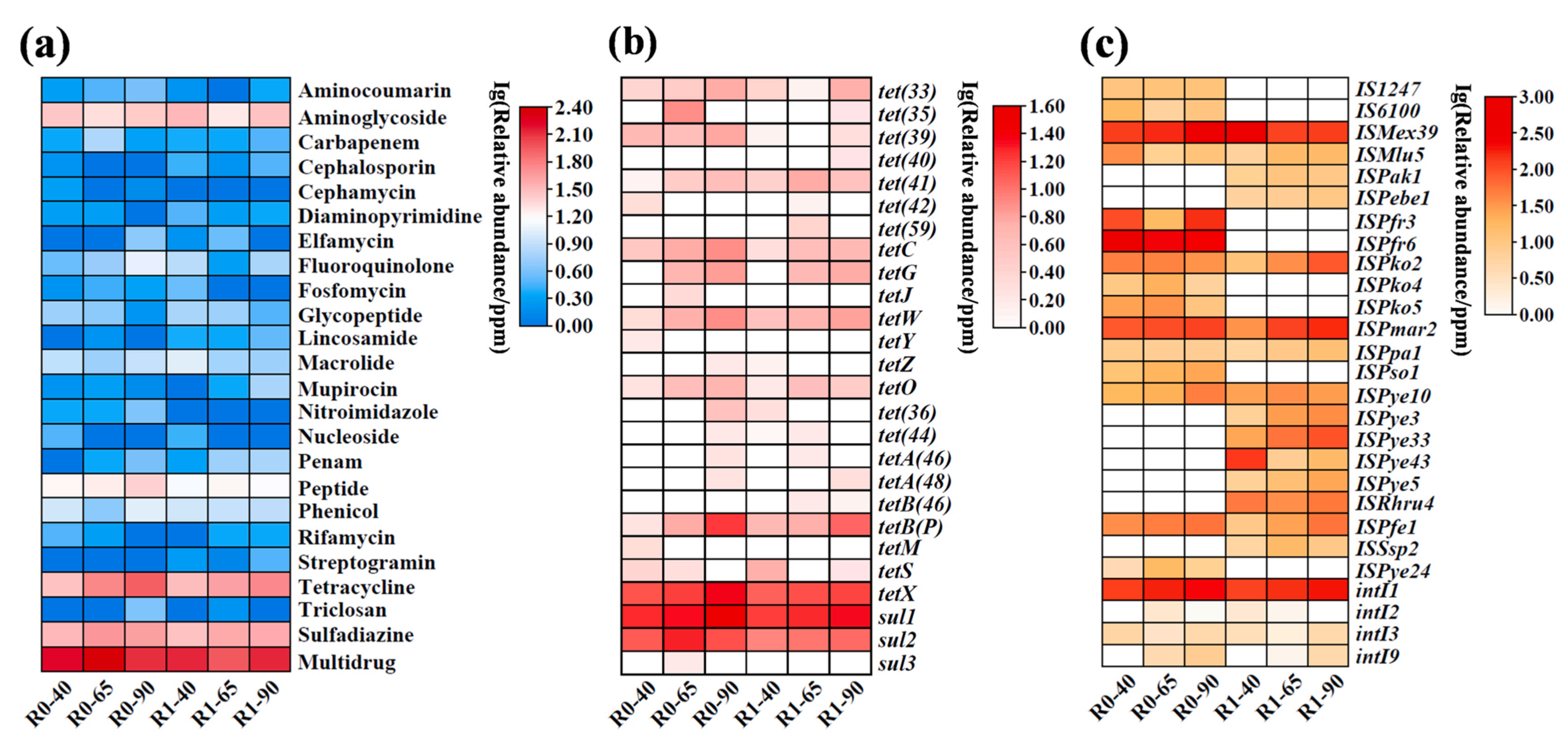 此外,一些非TC和SDZ相關(guān)的ARGs也被富集,是由于抗生素的共選擇效應(yīng),即一些微生物可以編碼存在于同一染色體、質(zhì)粒、轉(zhuǎn)座子或整合子中的多個(gè)ARGs,而氨基糖苷類(lèi)和多肽的比例增加更明顯,可能是由于它們對(duì)TC和SDZ的選擇壓力更敏感。R0和R1中檢測(cè)到的TC/SDZ相關(guān)的ARGs亞型總數(shù)有26個(gè)((23tets?及 3?suls),其中17個(gè)tets和2個(gè)suls是共有的,R0和R1中tetX基因含量最高,而sul1在R0和R1中為優(yōu)勢(shì)基因,由于tetX基因參與了TC的生物降解和轉(zhuǎn)移,因此兩種反應(yīng)體系中TC的高去除效率可以歸因于該基因的顯著富集,sul1明顯的富集可能與intI1介導(dǎo)的水平基因轉(zhuǎn)移(HGT)過(guò)程有關(guān)。