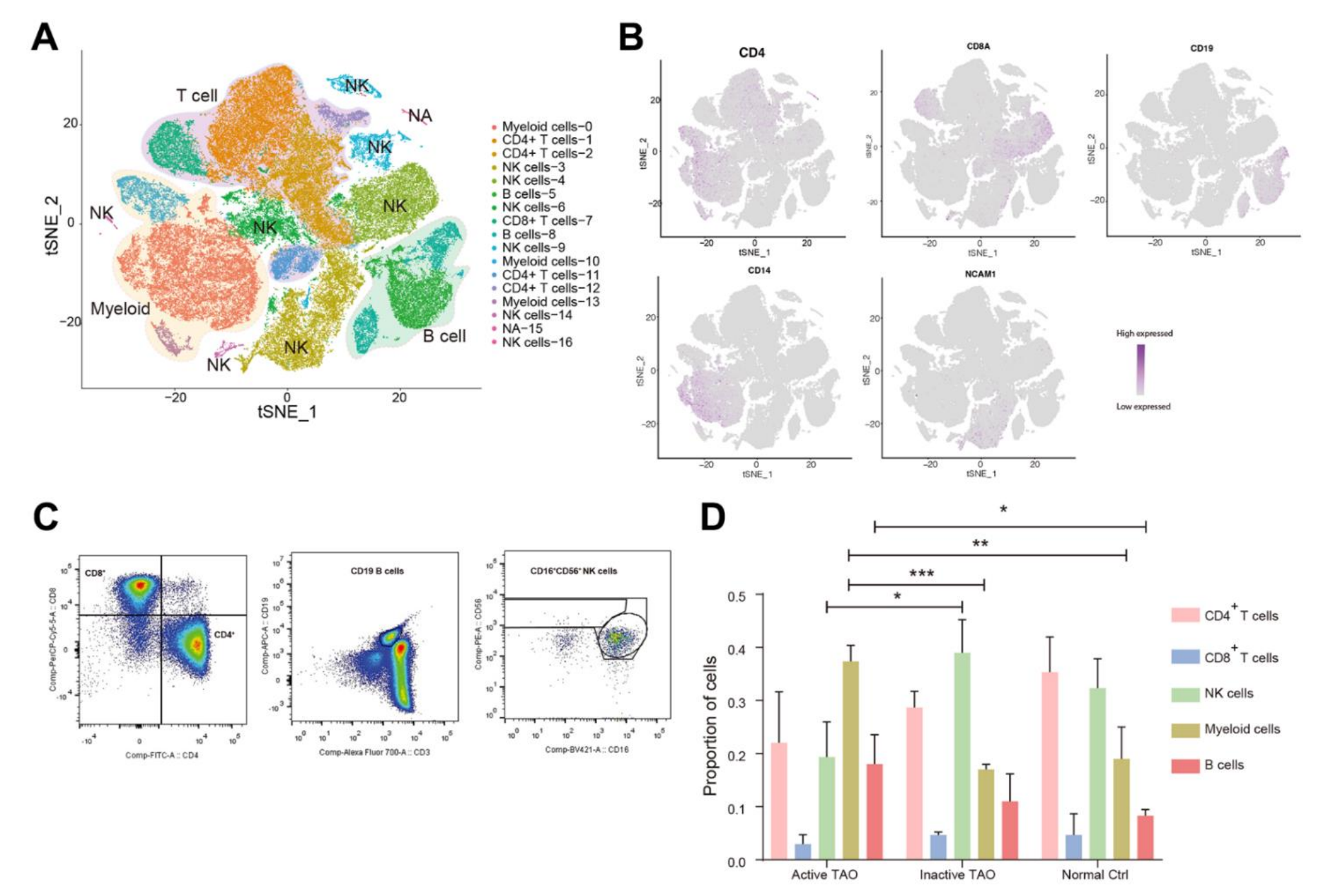 該研究使用10x Genomics Chromium平臺對總共9個樣本進行了scRNA-seq。經(jīng)過初步質(zhì)量控制后,總共獲得了93,007個PBMC用于后續(xù)分析,其中包括來自活性TAO的23,051個細胞、來自非活性TAO的34797個細胞和來自正常對照 (NC) 的35,159個細胞?;趫D的聚類分析確定了17個不同的聚類。在手動確認細胞類型注釋后,該研究成功將簇分為五種主要的PBMC細胞類型。其中包括各種CD4+ T細胞群 (CD4+)、NK (CD56+)、CD8+T細胞 (CD8A+)、B細胞 (CD19+) 和骨髓細胞 (CD11b+)(圖1A,1B)。通過流式細胞術(shù)分析驗證了scRNA-seq鑒定的這五種細胞類型的存在(圖1C)。值得注意的是,17個細胞簇中的12個 (70.6%) 包含來自多個單獨樣本的至少100個細胞,每個簇內(nèi)平均有9個單獨樣本。