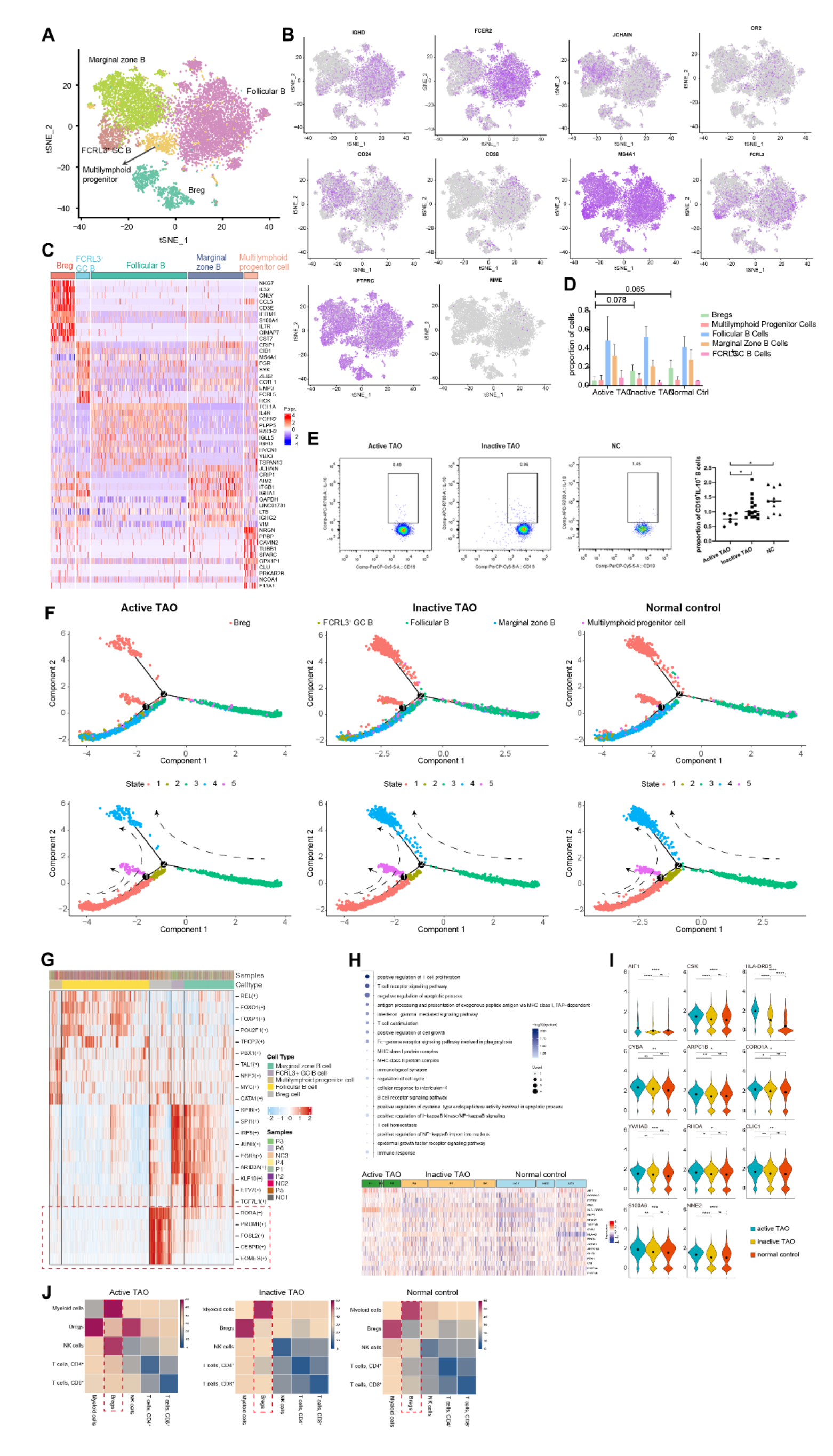進行軌跡分析以闡明不同B細胞亞群之間的動態(tài)關(guān)系。分析發(fā)現(xiàn)了3個分支點和5 個不同的狀態(tài)。狀態(tài)1的特征是邊緣區(qū)B細胞和FCRL3高GC B細胞同時分布。狀態(tài) 2由一小部分濾泡B細胞組成。狀態(tài)3主要由濾泡B細胞組成。狀態(tài)4和狀態(tài)5主要由 Breg組成。此外,所有狀態(tài)都表現(xiàn)出彌散的多淋巴細胞祖細胞(圖2F)。與之前的發(fā)現(xiàn)一致,該研究觀察到活性TAO中處于狀態(tài)4和狀態(tài)5的Bregs細胞密度降低。根據(jù)SCENIC分析,發(fā)現(xiàn)一組受不同轉(zhuǎn)錄因子調(diào)控的獨特基因在Bregs中特異性表達,而在其他細胞類型中幾乎不存在(圖2G)。在Bregs中,受RORA、CEBPD、PRDM1、FOSL2和EOMES調(diào)控的基因顯示出明顯更高的表達水平。