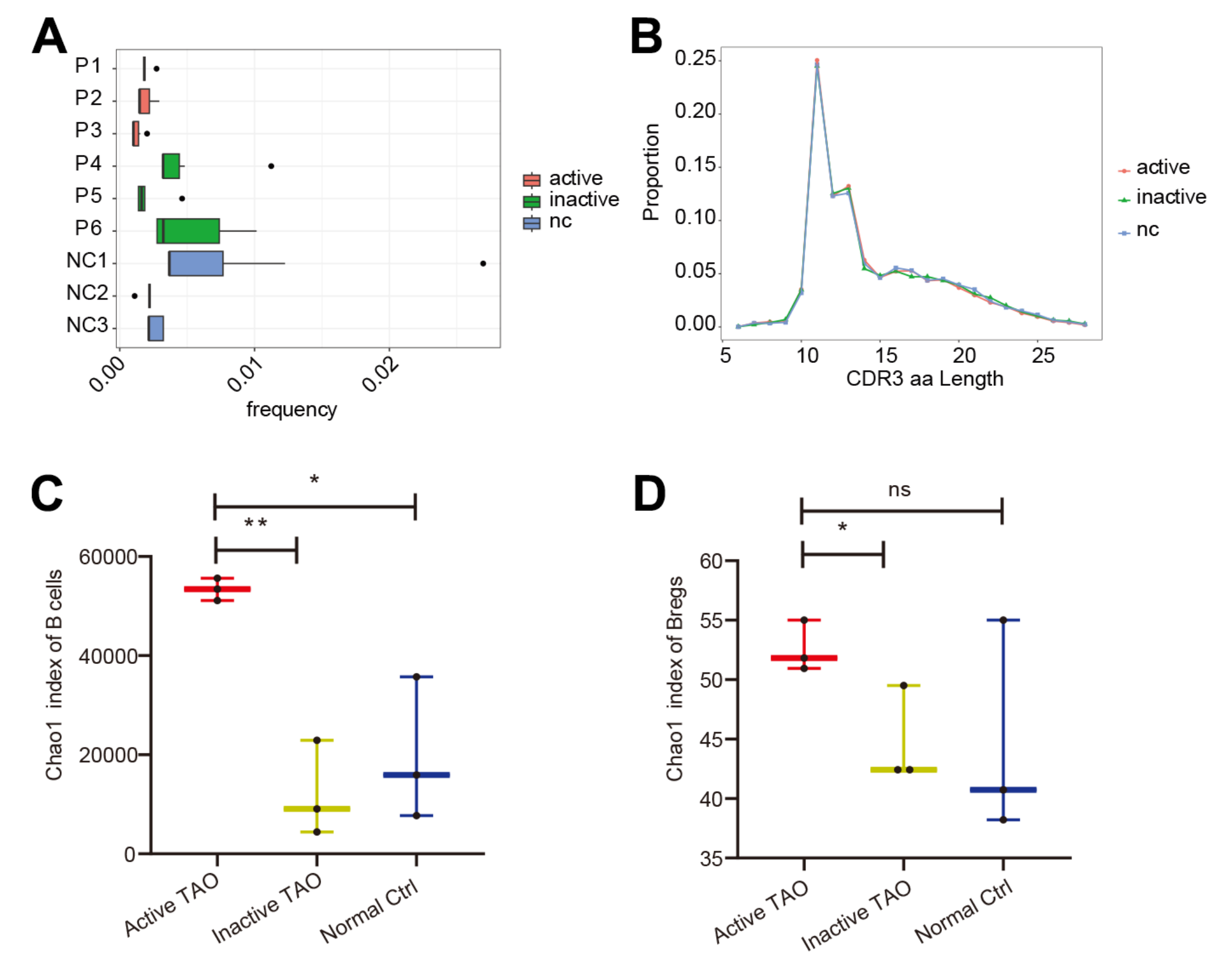 為了全面分析B細胞群中的基因表達和BCR多樣性,該研究對scRNA-seq分析中使用的PBMC樣本進行了scBCR-seq。在活性TAO中,前10個克隆型的比例(0.17%)與非活性組(0.37%,p=0.010)和NC組(0.41%,p=9.31E-05)(圖3A)。然而,對互補決定區(qū)3 (CDR3) 長度的分析沒有顯示任何明顯的變化(圖3B)。當檢查CDR3的多樣性時,通過Chao1指數(shù)量化,與NC組 (p=0.016) 和非活動TAO組 (p=0.002) (圖3C)。Breg細胞中也出現(xiàn)了類似的趨勢(圖 3D),與NC組相比顯著增加(p=0.011),但活性TAO之間沒有統(tǒng)計學顯著差異組和NC組 (p=0.213)。這些發(fā)現(xiàn)表明,雖然活性TAO中前10個克隆型的頻率降低,但在這種情況下CDR3序列的多樣性增加,這可能對免疫反應的調(diào)節(jié)有影響,并有助于活性TAO的發(fā)病機制。