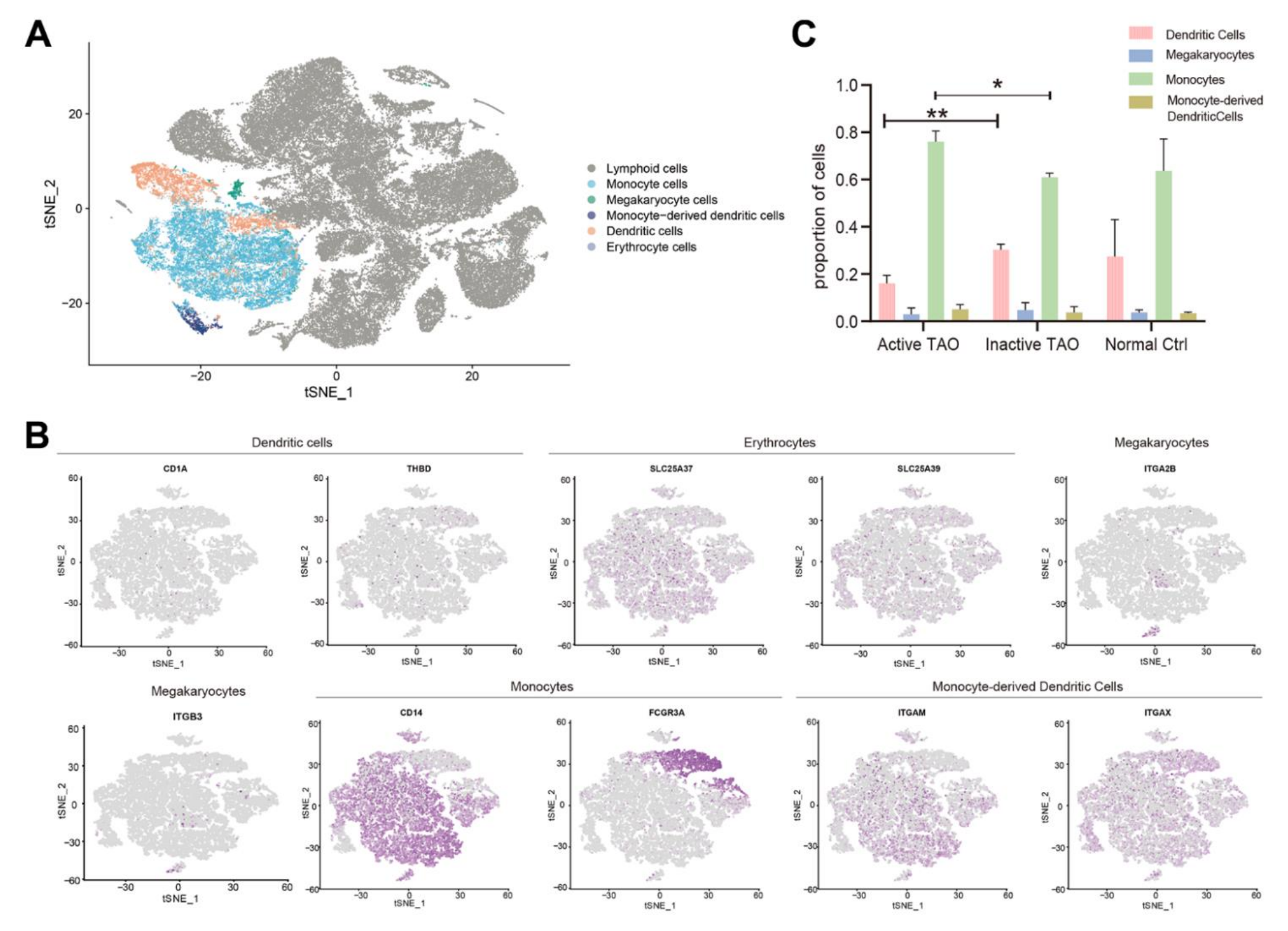 為了評估骨髓細胞在TAO中的參與情況,該研究鑒定了骨髓細胞的主要亞型,并檢查了它們在活性TAO中的配置。分析顯示了五種不同的骨髓細胞群,即單核細胞、巨核細胞、樹突狀細胞 (DC)、單核細胞衍生的DC和紅細胞(圖4A )。這些細胞類型的鑒定基于差異基因表達和對已建立的譜系標記的檢查(圖4B)?;钚訲AO 和非活性TAO之間的比較揭示了單核細胞和DC比例的顯著差異。與非活動TAO組相比,活動TAO患者的單核細胞比例顯著較高 (p=0.006),而活動TAO中DC的比例顯著較低 (p= 0.003) (圖4C)。這些發(fā)現(xiàn)表明,單核細胞水平增加和DC數(shù)量減少可能是TAO患者活動性疾病狀態(tài)的特征。