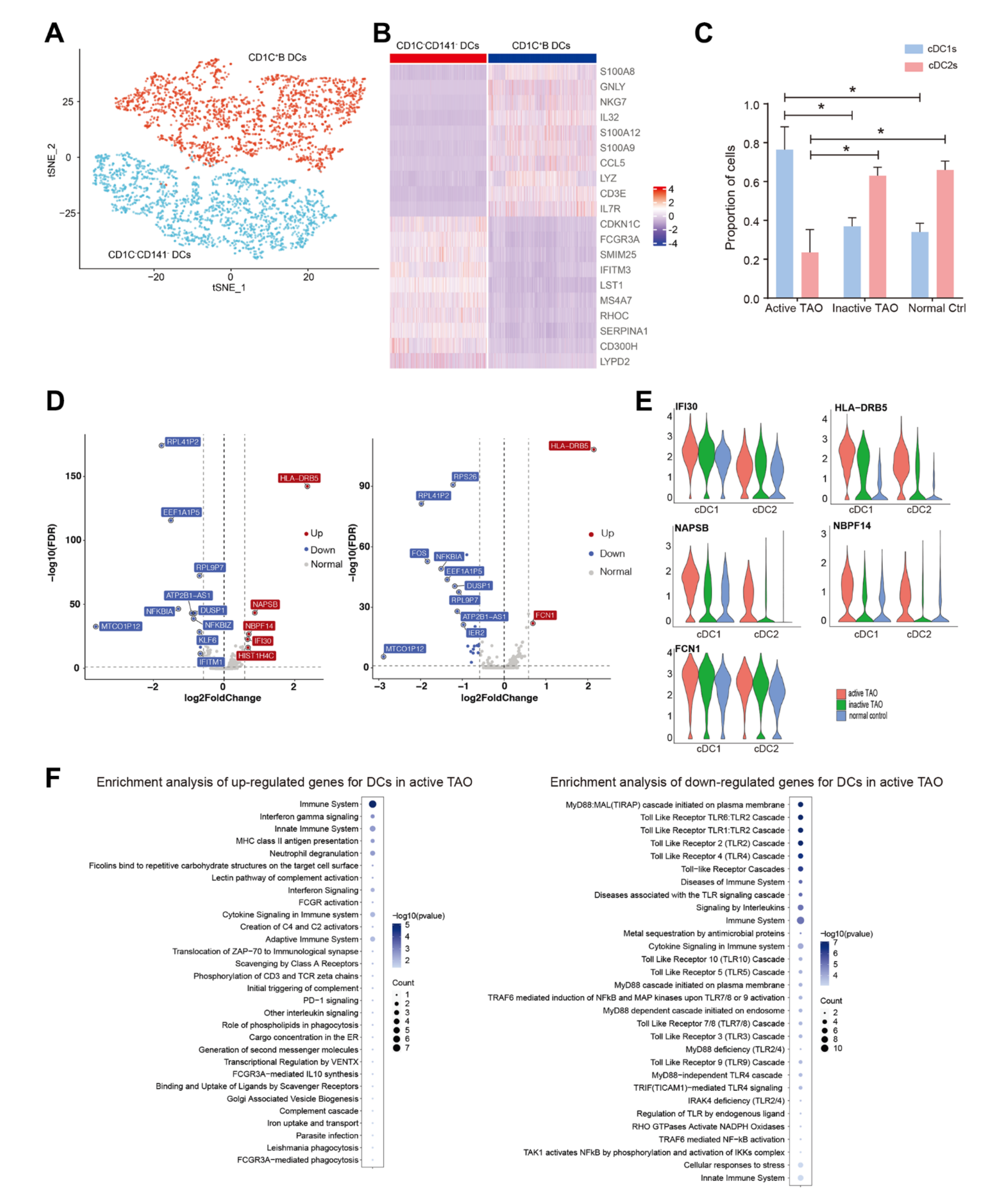 DC被細分為三個不同的子簇。Cluster 0被指定為cDC1s,其特征是高表達CDKN1C、FCGR3A、SMIM25、IFITM3、LST1MS4A7,以及CD1C CD141的低表達。簇1和簇2被鑒定為cDC2,其炎癥基因的表達水平升高,例如 CD14、S100A8、GNLY、NKG7 、IL32S100A12(圖5A、5B)。cDC1s的比例在活性TAO中顯著較高,而cDC2s在非活性TAO和NC中更為普遍(圖 5C)。鑒于cDC1和cDC2在免疫調(diào)節(jié)中發(fā)揮不同的作用- cDC1專門誘導Th2反應,而cDC2亞群表現(xiàn)出更強大的誘導Th1反應的能力[42],該研究進一步檢查了它們的基因表達譜。