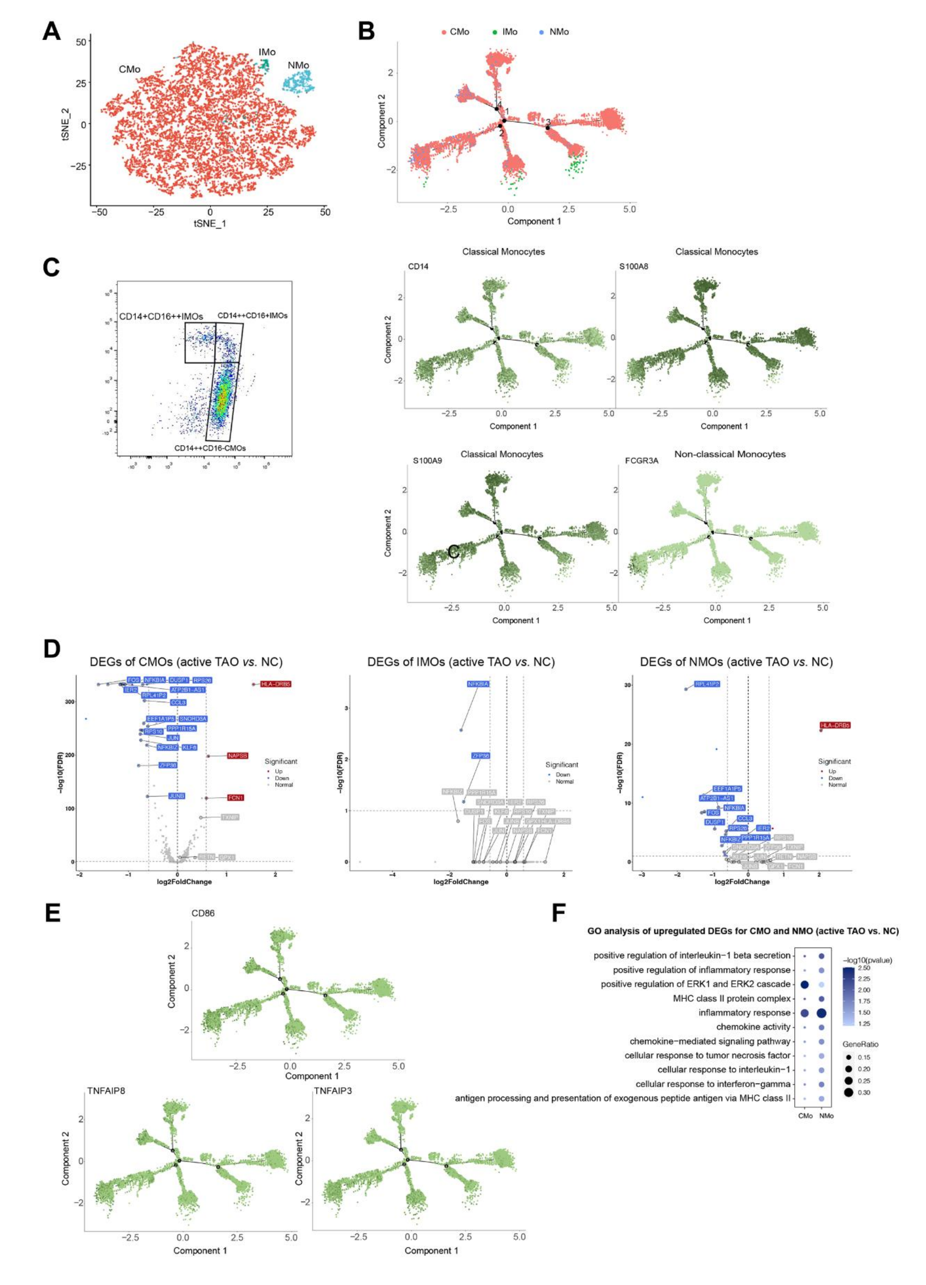 作者的聚類分析成功地從總共 12,959 個單核細胞中識別出三個不同的亞群。第一個簇的特征是經(jīng)典單核細胞 (CMO),其表現(xiàn)出高表達水平的CD14、S100A8 S100A9。第二個簇被鑒定為非經(jīng)典單核細胞 (NMO),其特征是高表達FCGR3A(也稱為 CD16)。第三簇被識別為中間單核細胞 (IMO),CD14FCGR3A均高表達(圖6A、6B)。為了驗證這些單核細胞亞簇,進行了流式細胞術(shù)分析,確認 CMO為CD14++CD16-,NMO為CD14+CD16++,IMO為CD14++CD16+(圖6C)。軌跡推斷分析表明,單核細胞遵循從CMO開始并向NMO和IMO狀態(tài)分支的發(fā)育軌跡(圖6B)。這些對TAO期間單核細胞發(fā)育狀態(tài)變化的觀察表明它們在該疾病中的潛在作用。