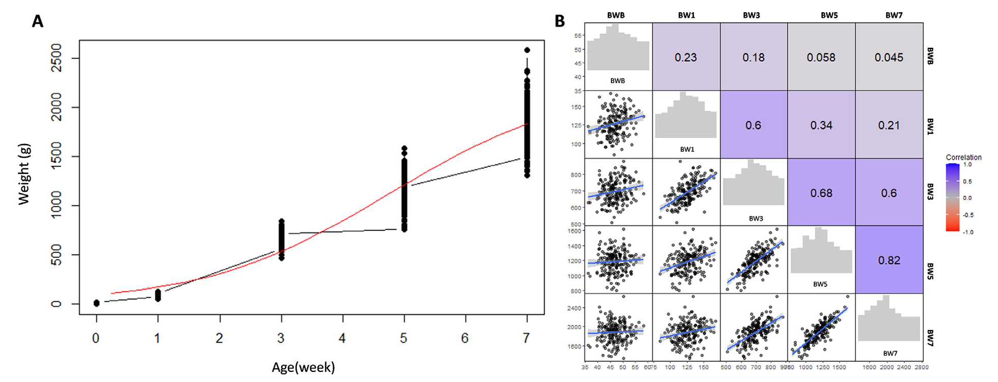 該研究對金陵白鴨(n = 201)在不同時期的體重進(jìn)行統(tǒng)計,BWB、BW1、BW3、BW5和BW7的體重均值分別為46.93g、127.19g、697.17g、1182.43g和1,888.52g。生長曲線結(jié)果顯示:金陵白鴨第3周-第5周生長最快,第5周后生長放緩。體重的分散度隨著年齡和體重的增加而增加。相鄰2周的體重之間存在較強(qiáng)的相關(guān)性,BW3與BW1(r = 0.6)、BW5(r = 0.68)和BW7(r = 0.6)顯著正相關(guān),BW5與BW7顯著正相關(guān)(r = 0.82)。但隨著時間間隔的延長,性狀間的相關(guān)性降低,BW1與BW7的相關(guān)性不顯著(r = 0.21),BWB則與BW3 (r = 0.18), BW5 (r = 0.058),BW7 (r = 0.45)均不顯著相關(guān)。