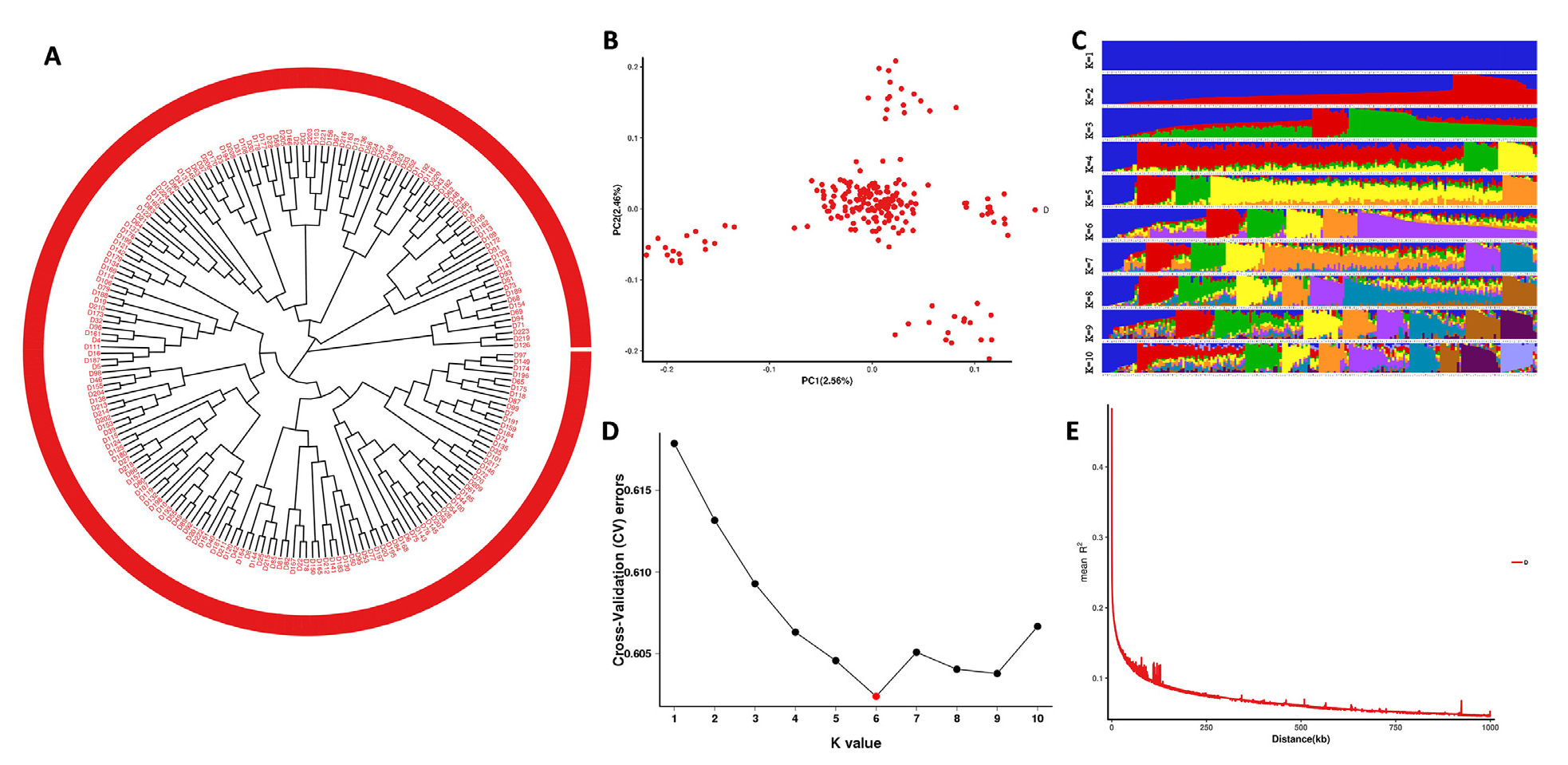 進(jìn)化分析:進(jìn)化樹構(gòu)建;群體結(jié)構(gòu)分析;PCA分析;LD衰減分析等