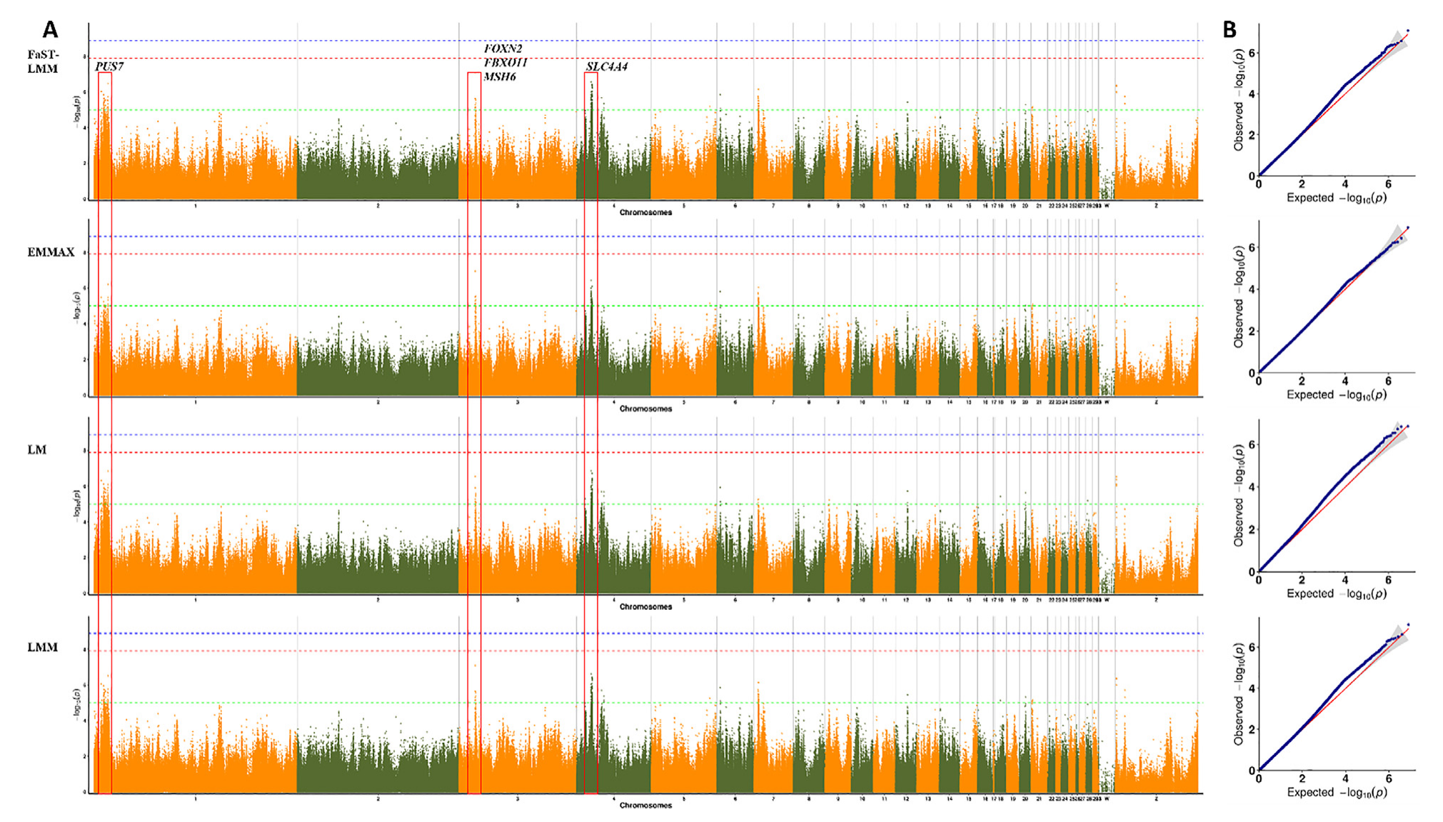 作者對出生體重(BWB)、1周體重(BW1)、3周體重(BW3)、5周體重(BW5)和7周體重(BW7)進(jìn)行了全基因組關(guān)聯(lián)分析,4種統(tǒng)計模型比較研究表明,F(xiàn)aST-LMM表現(xiàn)出最優(yōu)的效率,產(chǎn)生更多的結(jié)果和最小的假陽性。