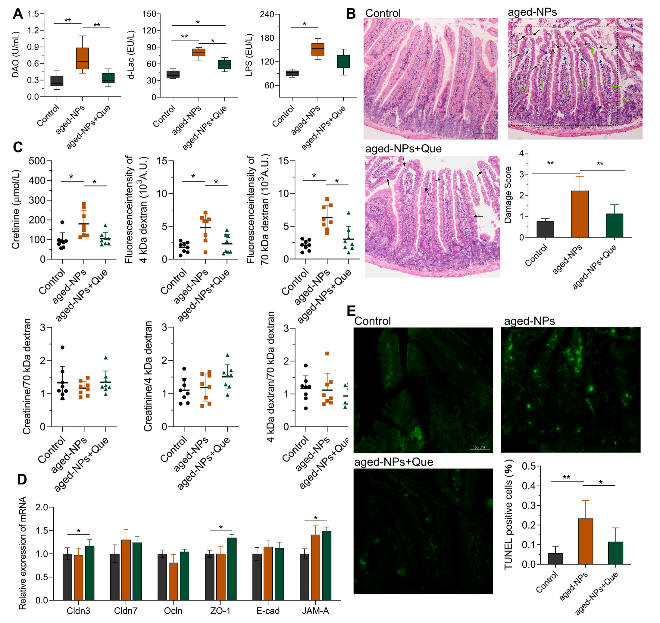 組織病理學(xué)結(jié)果顯示,老化NPs組的血清DAO、d-Lac和LPS水平顯著高于對照組,說明老化NPs誘導(dǎo)的腸道通透性增加,而Que降低了這些升高的水平,恢復(fù)了腸道屏障的完整性。形態(tài)學(xué)結(jié)果顯示老化NPs組的腸絨毛結(jié)構(gòu)有萎縮、變形、長度減少等結(jié)構(gòu)損傷,Que治療可減輕老化NPs引起的組織學(xué)損傷,促進腸腺體恢復(fù),保留絨毛形態(tài),減少淋巴細胞浸潤,值得注意的是,Que保護了腸道內(nèi)部結(jié)構(gòu),但對腸上皮和管腔之間的界面影響較小。