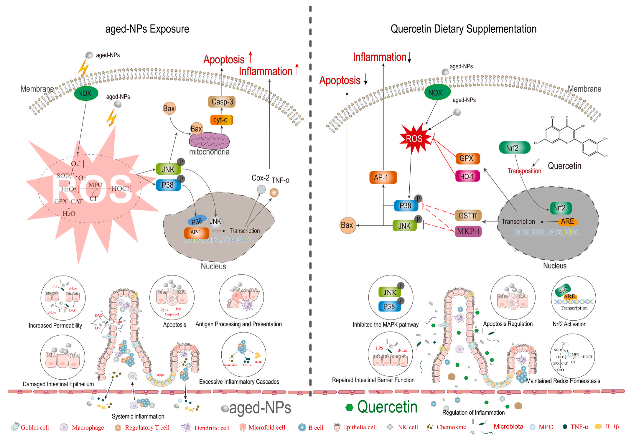 血清肌酐等指標(biāo)結(jié)果顯示,老化NPs刺激顯著增加了血清中標(biāo)記物的水平,表明細胞旁通透性增強,Que減弱了細胞旁通透性,恢復(fù)了接近對照的標(biāo)記水平,這些結(jié)果說明腸道屏障的破裂主要歸因于腸上皮細胞的丟失和死亡,而不是緊密連接的破壞。磨蝕效應(yīng)和程序性細胞死亡可能為損傷的主要原因。TUNEL結(jié)果顯示,與對照組相比,老化NPs組的熒光標(biāo)記細胞更多,而老化NPs+Que染色的上皮細胞數(shù)量減少,表明Que對上皮細胞凋亡具有保護作用。JNK通路的激活通過bax-線粒體途徑促進細胞凋亡,MAPK信號通路是KEGG富集通路之一,它在細胞凋亡過程中起著至關(guān)重要的作用,p-JNK作為MAPK通路的一個主要分支,p-JNK在老化NPs組顯著增強,此外,衰老的nps也增加了JNK的靶蛋白c-Jun的磷酸化水平,結(jié)果表明,老化NPs通過JNK信號通路激活bax-線粒體凋亡通路,從而誘導(dǎo)細胞凋亡。在老化NPs處理中,DHE染色顯示出較高的紅色熒光密度和明顯的亮點,表明ROS水平較高,而在老化NPs+Que中沒有,添加Que顯著降低了老化NPs處理后高過氧化氫和?O2-的存在,NOX活性測定結(jié)果顯示,與對照組相比,老化NPs和老化NPs+Que處理均導(dǎo)致NOX活性增加,且之間無顯著差異,表明Que的主要作用是作為一種自由基清除劑,而不是一種自由基生成的抑制劑。