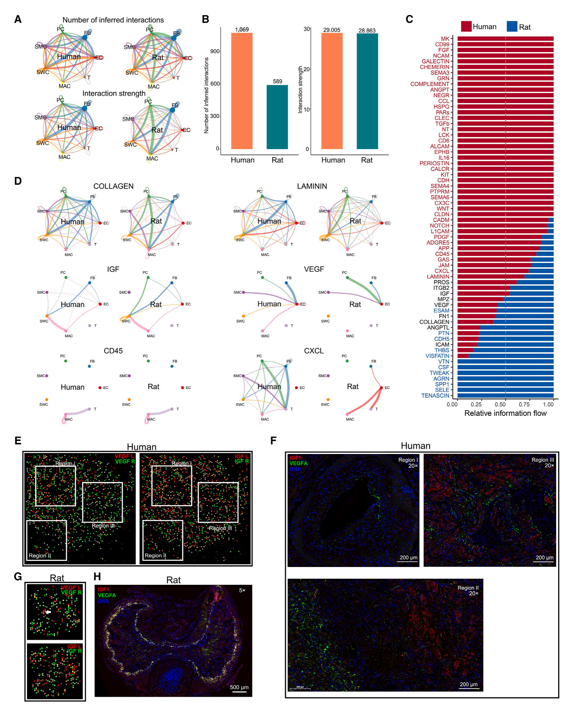 為了研究、比較人類和大鼠間CC微環(huán)境的復(fù)雜信號(hào)網(wǎng)絡(luò),研究者使用scRNA-seq數(shù)據(jù)進(jìn)行CellChat分析,發(fā)現(xiàn)大鼠CC中的細(xì)胞互作數(shù)量雖然小于人類,但細(xì)胞互作強(qiáng)度是相似的?;谶@些互作的表達(dá)模式,研究者進(jìn)行簡(jiǎn)單的分類,發(fā)現(xiàn)雖然胞外基質(zhì)相關(guān)的互作整體強(qiáng)度與細(xì)胞類型間配體-受體強(qiáng)度相當(dāng),但兩者基因組成是有差異的;血管生成相關(guān)的互作整體強(qiáng)度在人類和大鼠中沒(méi)有差異,但基因組成存在差異,如大鼠CC微環(huán)境中是主要是VEGFB表達(dá),而人類CC微環(huán)境中高表達(dá)的是VEGFA和IGF1。
