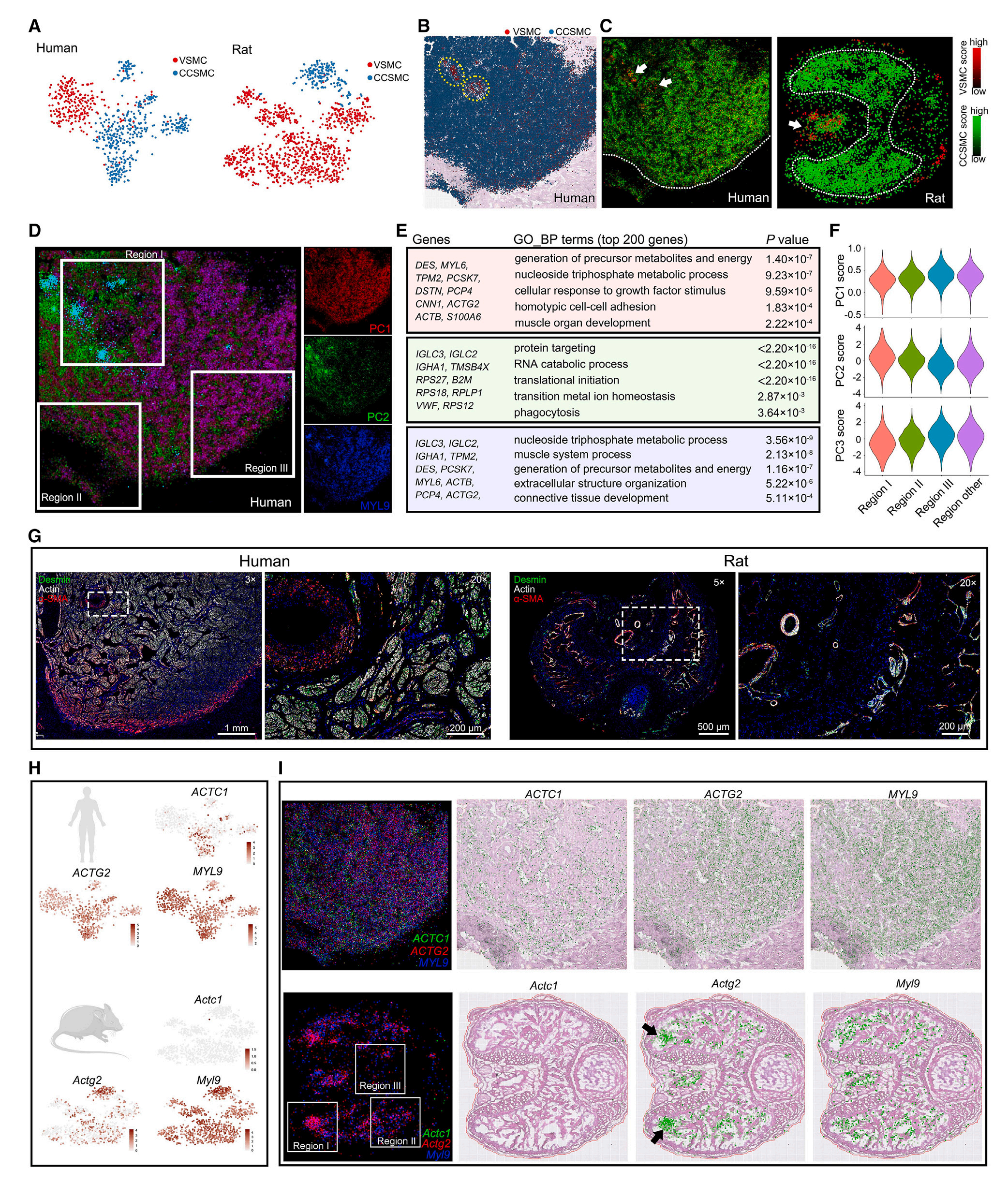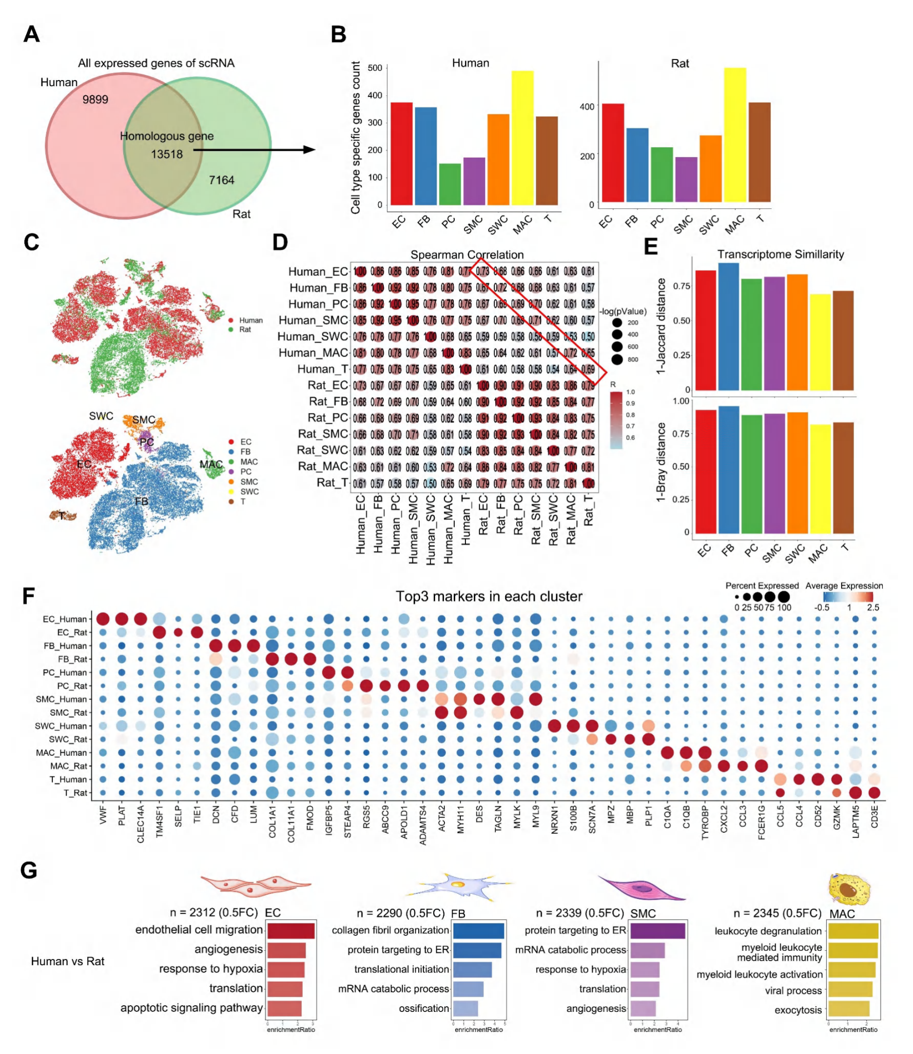 通過(guò)分析空間轉(zhuǎn)錄組數(shù)據(jù)中的人—鼠同源基因,研究者找到人類和大鼠共有的459個(gè)top SVG,大多數(shù)SVG并不是細(xì)胞類型特異的,其中EC、FB和SMC是表達(dá)這些SVG最多的3種類型細(xì)胞。富集分析結(jié)果顯示,基礎(chǔ)生物學(xué)過(guò)程如“translational initiation”、“extracellular structure organization”以及“protein targeting”,在人類和大鼠CC組織的空間轉(zhuǎn)錄組數(shù)據(jù)中是保守的;人類特異SVG主要與炎癥響應(yīng)有關(guān),而這些SVG的大鼠同源基因主要與代謝過(guò)程有關(guān)。