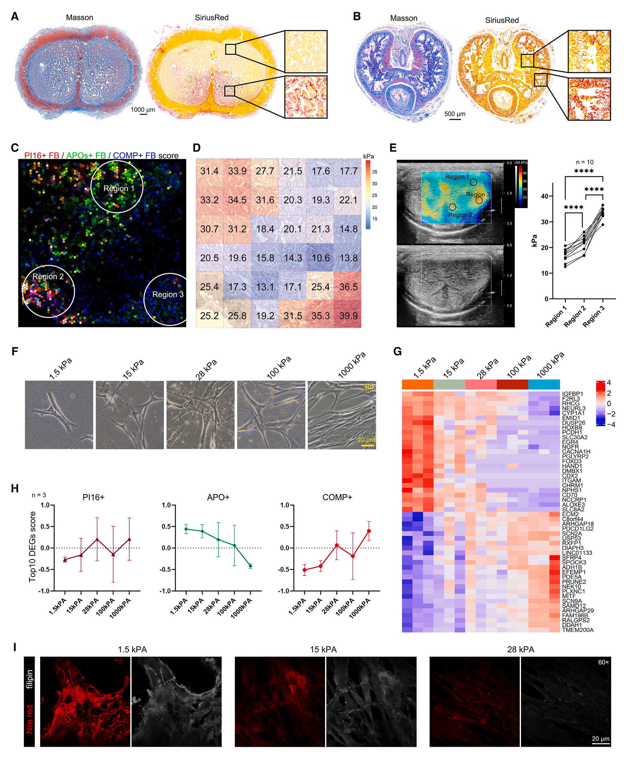 本研究中,研究者發(fā)現(xiàn)COMP+ FB生態(tài)位顯著富集了“integrin-mediated signaling pathway”和“response to mechanical stimulus”term;人和大鼠CC中ECM/細(xì)胞組成比例表現(xiàn)出明顯的空間異質(zhì)性;空間轉(zhuǎn)錄組數(shù)據(jù)和免疫熒光染色結(jié)果類似,靠近陰莖背神經(jīng)血管束的上極區(qū)域顯示出較低的纖維化水平,而遠(yuǎn)離背神經(jīng)血管束的顯示出較高的纖維化水平;空間轉(zhuǎn)錄組數(shù)據(jù)和超聲彈性成像結(jié)果都表明,APO+ FB與更柔軟的組織硬度有關(guān),而COMP+ FB與更硬的組織有關(guān);不同胞外基質(zhì)硬度培養(yǎng)下的CC FB形態(tài)不同,bulk RNA-seq數(shù)據(jù)顯示機(jī)械應(yīng)激顯著改變了FB的轉(zhuǎn)錄狀態(tài),一些參與調(diào)控脂質(zhì)代謝的基因與低機(jī)械力信號(hào)有關(guān);scRNA-seq數(shù)據(jù)分析結(jié)果顯示APO+ FB分值隨組織硬度增加而降低,COMP+ FB分值隨組織硬度增加而增加;染色結(jié)果顯示隨著組織硬度增加,F(xiàn)B中的中性脂質(zhì)和膽固醇累積降低。