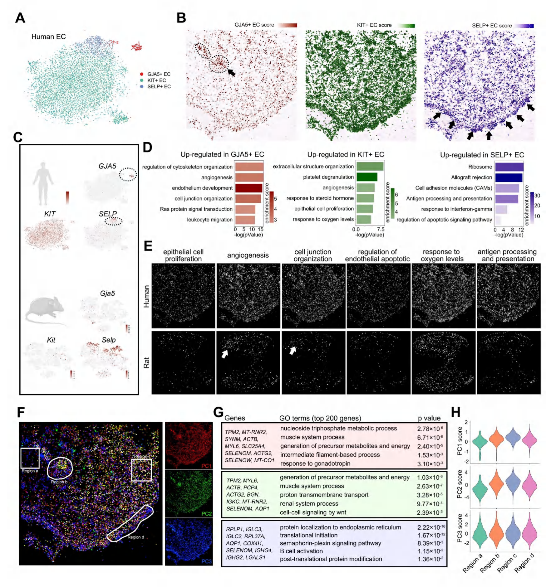 根據(jù)以往的解剖觀察以及scRNA-seq數(shù)據(jù)分析,可知CC中包含3種類型EC(內(nèi)皮細(xì)胞),包括GJA5+ EC(動(dòng)脈內(nèi)皮細(xì)胞)、SELP+ EC(靜脈內(nèi)皮細(xì)胞)以及KIT+ EC(海綿體竇內(nèi)皮細(xì)胞)。人類CC中GJA5+ EC占比最低,主要分布在海綿體動(dòng)脈區(qū)域;SELP+ EC主要分布在白膜區(qū)域;KIT+ EC廣泛分布。但大鼠CC中,Selp+ EC比例更高,Gja5和Kit可能并不是有用的靜脈和CC內(nèi)皮細(xì)胞標(biāo)志物?;趕cRNA-seq數(shù)據(jù)進(jìn)行GO分析,研究者發(fā)現(xiàn)不同類型EC富集了不同功能,多數(shù)細(xì)胞類型特異性的term(條目)在人類CC中并沒(méi)有空間分布異質(zhì)性,但一些特殊term在大鼠CC中表現(xiàn)出空間分布異質(zhì)性。
