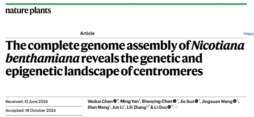 2024年11月14日,北京大學(xué)現(xiàn)代農(nóng)業(yè)研究院郭立研究員團隊的本氏煙草完整基因組研究成果以“The complete genome assembly of?Nicotiana benthamiana?reveals the genetic and epigenetic landscape of centromeres”為題,在國際著名期刊Nature Plants上在線發(fā)表。
