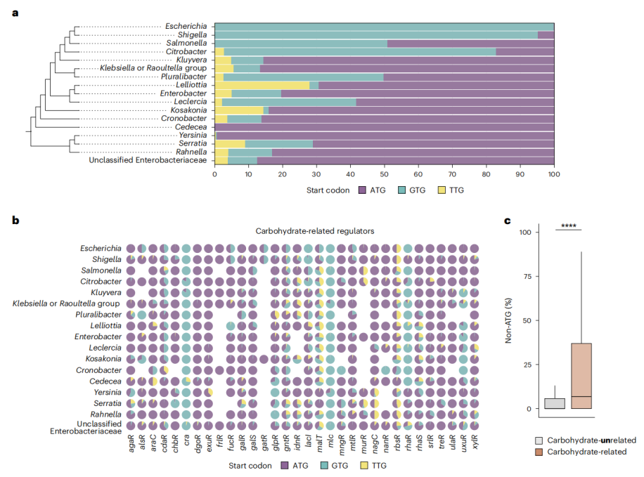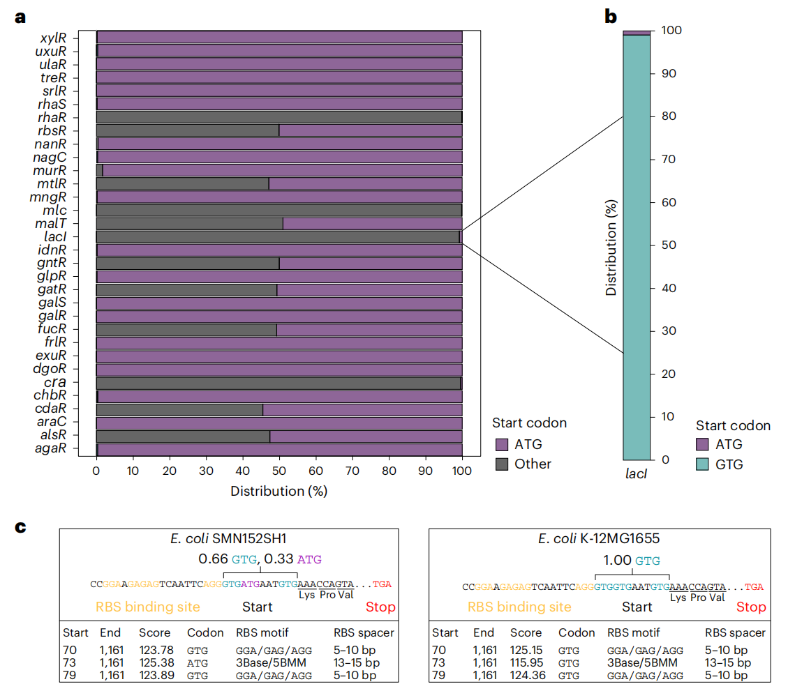 研究人員分析了 10643 個大腸桿菌基因組,發(fā)現(xiàn) 32 個碳水化合物代謝調節(jié)基因中,有 13 個基因具有非標準起始密碼子,例如 GTG 或 TTG。其中,lacI 基因幾乎全部包含非標準起始密碼子,而 rbsR、murR、mltR、malT、gntR、gatR、fucR、araC 和 alsR 等基因則同時存在 ATG 和非標準起始密碼子。這種現(xiàn)象表明非標準起始密碼子在碳水化合物代謝調節(jié)中可能具有重要作用。