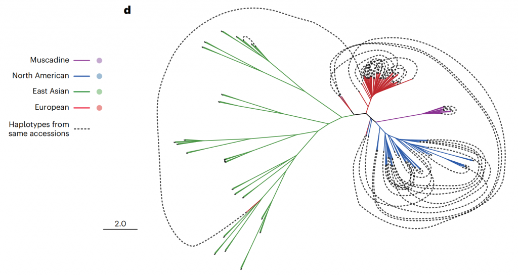 鑒于葡萄基因組因頻繁雜交而具有的高度雜合性,單倍型基因組不僅能精確解析雜合區(qū)域序列,而且對分析葡萄的育種歷史也至關重要。該研究構(gòu)建了單倍型系統(tǒng)發(fā)育進化樹,揭示了葡萄屬植物復雜的育種歷史和豐富的遺傳多樣性。結(jié)果顯示,北美和歐洲品種存在較多內(nèi)部雜交,而東亞品種的內(nèi)部雜交較少,跨大洲雜交事件有限(圖2)。特別是東亞葡萄極少被開發(fā)的遺傳多樣性,表明了其潛在的巨大育種價值。此次發(fā)布的東亞野生葡萄基因組為葡萄遺傳育種研究提供了強有力的資源支持。