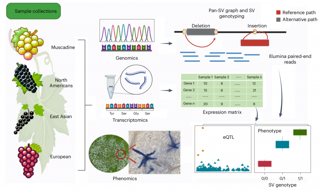 2025年02月26日,濰坊現(xiàn)代農(nóng)業(yè)山東省實驗室、北京大學現(xiàn)代農(nóng)業(yè)研究院葉文秀研究員和郭立研究員團隊在國際期刊《自然-遺傳學(Nature Genetics)》上在線發(fā)表了題為Super pangenome of Vitis?empowers identification of downy mildew resistance genes for grapevine improvement的研究成果作為葡萄科研領域里程碑式的重大突破,繪制了涵蓋葡萄屬的歐亞、北美和東亞世界三大種群的72個葡萄種質(zhì)材料的單倍型超級泛基因組圖譜,揭示葡萄屬豐富遺傳多樣性和雜交歷史,基于葡萄多組學數(shù)據(jù),挖掘到葡萄霜霉病抗性相關遺傳變異和抗病基因,加速葡萄精準分子育種,開啟葡萄種質(zhì)創(chuàng)新和利用新時代。百邁客生物為該研究提供了基因組、hic、轉(zhuǎn)錄組等測序服務。