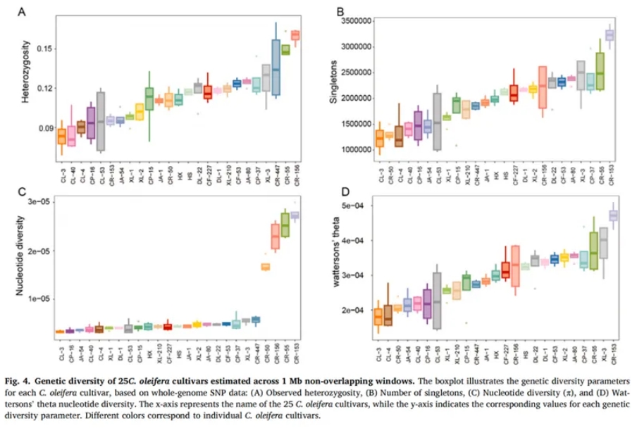 為了全面評估油茶種質(zhì)資源的遺傳多樣性,研究統(tǒng)計了包括雜合度(Heterozygosity)、核苷酸多樣性指數(shù)(π)、單態(tài)位點數(shù)量(Singleton)以及Watterson’s θ值等關(guān)鍵遺傳參數(shù)(Figure 4)。結(jié)果表明,川榮(CR)系列品種(如CR-153、CR-55)在各項遺傳變異指標(biāo)上均表現(xiàn)出較高水平,尤其是核苷酸多樣性指數(shù)(π)顯著高于其他品種。具體而言,singleton在長林(CL)系列品種(如CL-3、CL-4、CL-40)、翠屏(CP)系列(如CP-16)和江安(JA)系列品種(如JA-54)中較少,而在川榮CR-153和CR-55中則為最多(Figure 4B)。核苷酸多樣性(π)值的差異也較為顯著,川榮品種CR-50、CR-156、CR-55和CR-153的π值明顯高于其他品種,表明川榮系列品種具有較高的遺傳多樣性,可能為油茶品種改良和分子育種提供重要的遺傳資源(Figure 4C)。類似地,Wattersonθ分析進一步揭示了品種間分離位點的變化,川榮CR-153、湘林XL-3和CR-55表現(xiàn)出較高的θ值,與singleton的趨勢一致(Figure 4D)。近交系數(shù)(F)分析結(jié)果與遺傳多樣性模式一致,顯示川榮CR-156、CR-55和CR-447的F值最低,表明其遺傳多樣性較高,而長林CL系列品種(如CL-3、CL-40、CL-4)的F值較高,反映其遺傳多樣性較低??傮w而言,遺傳多樣性分析結(jié)果表明,長林(CL)系列品種由于長期的人工選育和馴化,遺傳背景較為單一,表現(xiàn)出較低的遺傳多樣性;而川榮系列品種則保持較高的遺傳多樣性。該研究結(jié)果為篩選核心種質(zhì)資源和制定育種策略提供了有力的遺傳依據(jù)。