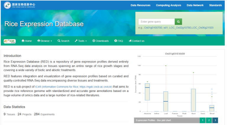 ☆?水稻基因表達(dá)庫(kù)RED:是一個(gè)基因表達(dá)譜存儲(chǔ)庫(kù),對(duì)跨越整個(gè)水稻生長(zhǎng)階段的組織進(jìn)行?RNA-Seq?數(shù)據(jù)分析,涵蓋各種生物和非生物處理。