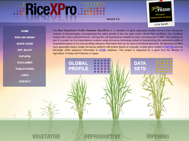 ☆?水稻表達(dá)譜數(shù)據(jù)庫(kù)RiceXPro:針對(duì)水稻植物在自然田間條件下的整個(gè)生長(zhǎng)過程、用各種植物激素處理的水稻幼苗以及通過激光顯微切割(LMD) 分離的特定細(xì)胞類型/組織,使用微陣列技術(shù)進(jìn)行水稻轉(zhuǎn)錄組分析,旨在表征水稻中所有預(yù)測(cè)基因的表達(dá)譜。