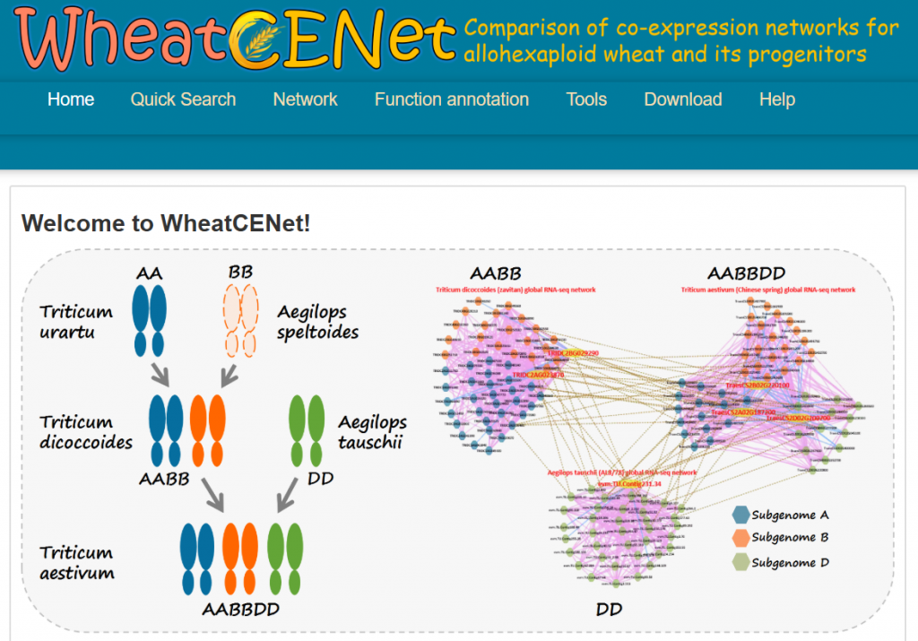 ☆?異源六倍體小麥及其祖先的比較共表達(dá)網(wǎng)絡(luò)分析數(shù)據(jù)庫(kù)WheatCENet:集成了功能注釋,蛋白質(zhì)-蛋白質(zhì)相互作用、miRNAs,GO注釋、GSEA等工具能夠搜索和比較特定的功能共表達(dá)網(wǎng)絡(luò),識(shí)別其中聚集的基因的相關(guān)功能。