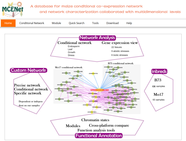 ☆?玉米多組學(xué)基因網(wǎng)絡(luò)分析平臺(tái):整合了701個(gè)轉(zhuǎn)錄組學(xué)數(shù)據(jù)和108個(gè)表觀基因組數(shù)據(jù),并研究了具有多維組學(xué)水平的不同條件網(wǎng)絡(luò)。MCENet?還提供?5?個(gè)網(wǎng)絡(luò)訪問分析工具包(即?Network Search、Network Remodel、Module Finder、Network Comparison?和?Dynamic Expression View)和多個(gè)網(wǎng)絡(luò)功能支持工具包。