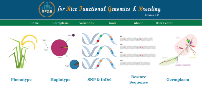 ☆?水稻功能基因組育種數(shù)據(jù)庫(kù)RFGB(v2.0):該數(shù)據(jù)庫(kù)整合了3024份水稻種質(zhì)資源的18M SNP、2.3M InDel、IRGSP所有基因單倍型和12種表型數(shù)據(jù),具有基因檢索、基因組變異可視化瀏覽、BLAST等功能,將表型數(shù)據(jù)和單倍型數(shù)據(jù)聯(lián)合分析,為挖掘基因有利單倍型提供數(shù)據(jù)支持。