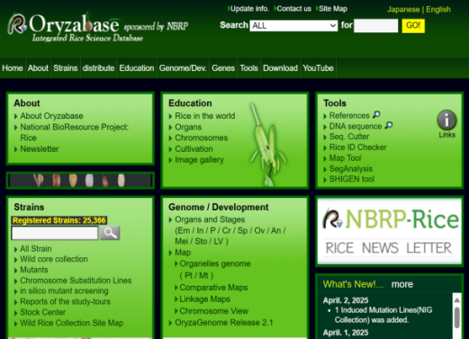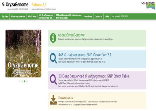 ☆?Oryzabase是一個(gè)綜合性水稻科學(xué)數(shù)據(jù)庫(kù),包含大量水稻品系庫(kù)存信息,突變體信息,染色體圖譜,基因字典,水稻科學(xué)基礎(chǔ)知識(shí)。OryzaGenome是野生Oryza物種的基因組數(shù)據(jù)庫(kù),為水稻研究提供了比較和進(jìn)化的組學(xué)方法。