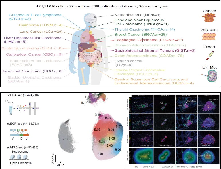 2024年,復(fù)旦大學(xué)附屬中山醫(yī)院樊嘉院士和高強教授、中國科學(xué)院上海免疫與感染研究所張曉明研究員、浙江大學(xué)基礎(chǔ)醫(yī)學(xué)院郭國驥教授合作在Science上發(fā)表了題為A blueprint for tumor-infiltrating B cells across human cancers的研究論文,結(jié)合單細(xì)胞轉(zhuǎn)錄組、 B細(xì)胞受體免疫組庫和表觀基因組的多組學(xué)數(shù)據(jù),系統(tǒng)性地刻畫了腫瘤浸潤性B細(xì)胞的異質(zhì)性、動態(tài)分化和表觀調(diào)控機制。創(chuàng)新地揭示了腫瘤微環(huán)境中廣泛存在的EF應(yīng)答的癌種偏好性、空間定位特征、臨床意義及潛在的誘導(dǎo)調(diào)控機制。