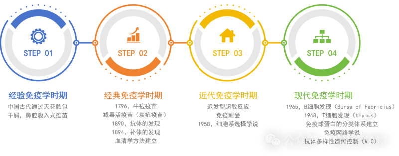 這是最早關(guān)于人類免疫學(xué)應(yīng)用的記錄。公元前?400?年,中國可能已有人痘苗接種預(yù)防天花的方法,到?16?世紀(jì)明朝隆慶年間,人痘接種法得到重大改進(jìn)并廣泛應(yīng)用,17?世紀(jì)傳入俄國、朝鮮、日本、土耳其和英國等國家,至18世紀(jì)末結(jié)束經(jīng)驗免疫學(xué)時期,隨后免疫學(xué)又經(jīng)歷了經(jīng)典免疫學(xué)時期,近代免疫學(xué)時期,直到1965年/1968年?B細(xì)胞/T細(xì)胞的發(fā)現(xiàn)開啟了現(xiàn)代免疫學(xué)時期。