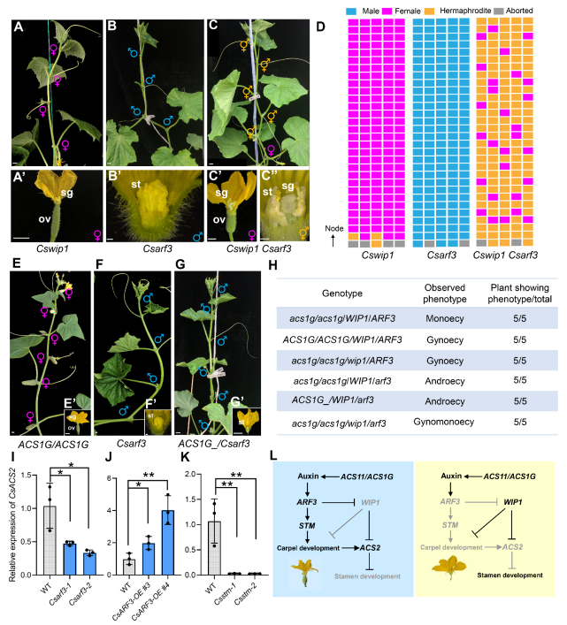 葫蘆科作物性型表現(xiàn)豐富,已逐漸成為研究性別決定的典型模式植物。葫蘆科作物的花在早期發(fā)育階段是兩性的,隨著心皮原基或雄蕊原基的發(fā)育停滯產(chǎn)生單性花?!吧L素促進(jìn)雌花產(chǎn)生”這一現(xiàn)象自上世紀(jì)50年代被植物學(xué)家觀察到以來,一直是植物生理學(xué)領(lǐng)域的“未解之謎”,且生長素與乙烯是如何協(xié)同調(diào)控植物單性花發(fā)育的遺傳機(jī)制仍模糊不清。