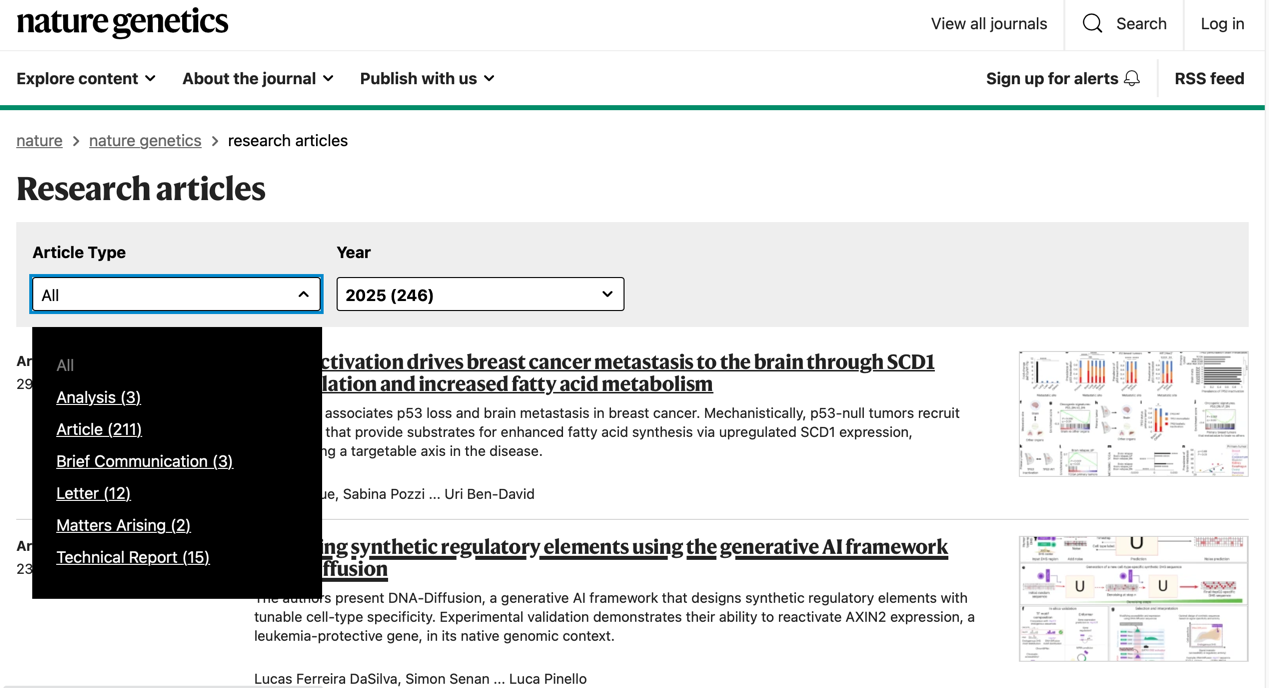 2025年,Nature Genetics共發(fā)表文章246篇,其中研究型論文(Article)211篇,其余為少量評述、簡報(bào)等類型文章。該期刊為月刊(Volume 57,Issues1-12),各期論文數(shù)量略有差異,但全年發(fā)表整體均勻,總發(fā)表量較上年穩(wěn)中有升。在所有發(fā)表文章中,植物相關(guān)文章僅39篇,占比約16%。