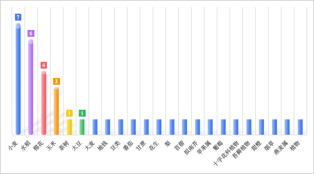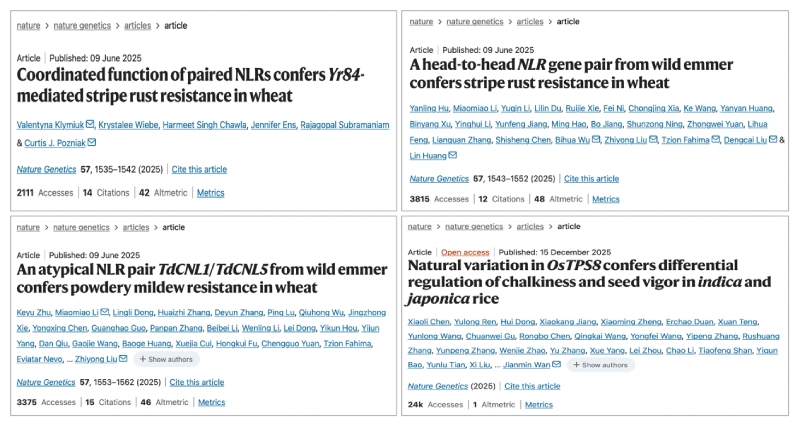 從物種分布來看,2025年度Nature?Genetics上發(fā)表的植物文章中,小麥占比最高,年發(fā)文量7篇。其中,2025年6月9日,該期刊同時在線發(fā)表三篇小麥抗病領(lǐng)域的重磅研究論文;其次依次為水稻(6篇)、棉花(4篇)、玉米(3篇)等物種。這一現(xiàn)象也印證了作物研究在全球植物科學(xué)與農(nóng)業(yè)生物育種中的核心地位。