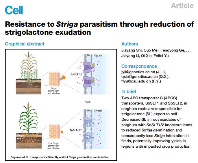 中國科學(xué)院遺傳與發(fā)育生物學(xué)研究所/玉米等作物種質(zhì)創(chuàng)新及分子育種全國重點實驗室主任謝旗研究員課題組、中國農(nóng)業(yè)大學(xué)于菲菲教授課題組以及中國科學(xué)院遺傳與發(fā)育生物學(xué)研究所/崖州灣國家實驗室李家洋院士課題組合作在Cell雜志在線發(fā)表研究論文,題為“Resistance?to?Striga?Parasitism?through?Reduction?of?Strigolactone?Exudation”。