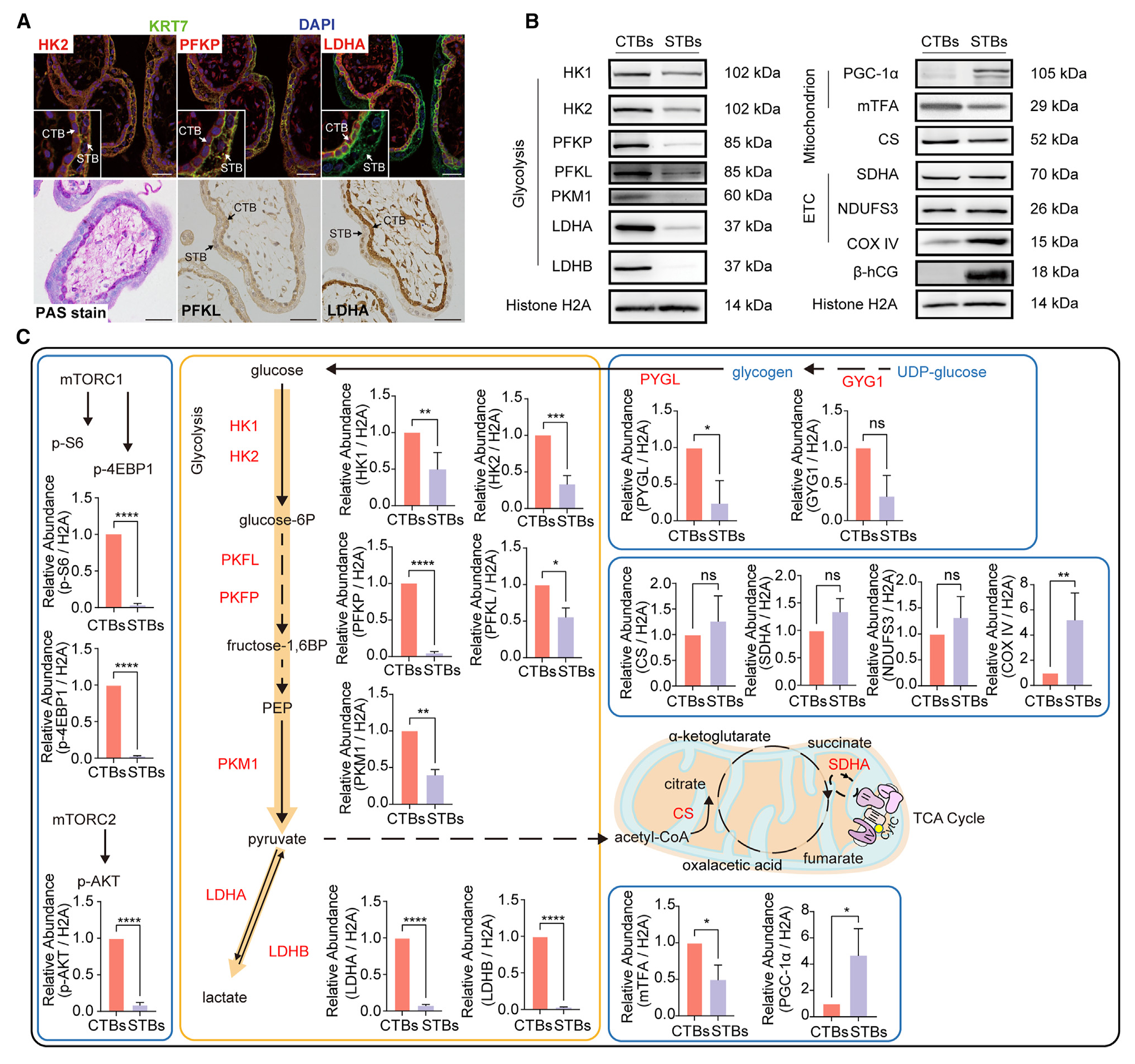 通過(guò)免疫組織化學(xué)和免疫熒光染色在孕早期人類(lèi)胎盤(pán)絨毛組織中,證實(shí)了許多關(guān)鍵的糖酵解酶,包括己糖激酶2 (HK2)、磷酸果糖激酶、血小板型(PFKP)、磷酸果糖激酶、肝型(PFKL)和乳酸脫氫酶A (LDHA),確實(shí)在CTBs中比體內(nèi)STBs更廣泛地表達(dá)(圖1A)。通過(guò)實(shí)時(shí)qPCR和免疫印跡(圖1B)繪制關(guān)鍵代謝酶的變化。結(jié)果顯示,糖酵解酶,包括己糖激酶1 (HK1)、HK2、PFKP、PFKL、丙酮酸激酶M1 (PKM1)、LDHA和乳酸脫氫酶B (LDHB), CTBs均顯著高于STBs(圖1B和1C)。線粒體生物發(fā)生相關(guān)轉(zhuǎn)錄因子PGC1a和細(xì)胞色素氧化酶(COX) IV在STBs中高表達(dá),而糖原代謝酶肝糖原磷酸化酶(PYGL)和糖原1 (GYG1)在CTBs中高于STBs(圖1C),與糖原的周期性酸-希夫(PAS)染色一致(圖1A)。在主要調(diào)控糖酵解酶的磷脂酰肌醇3-激酶(PI3K)-哺乳動(dòng)物雷帕霉素靶蛋白(mTOR)通路中,CTBs中蛋白激酶B (AKT)、核糖體蛋白S6 (S6)和真核翻譯起始因子4E (4EBP1)的磷酸化水平顯著高于STBs(圖1C左)。這些結(jié)果表明,糖酵解和糖原溶解的糖代謝途徑在合胞滋養(yǎng)細(xì)胞中顯著減少,而OxPhos水平基本保持不變。