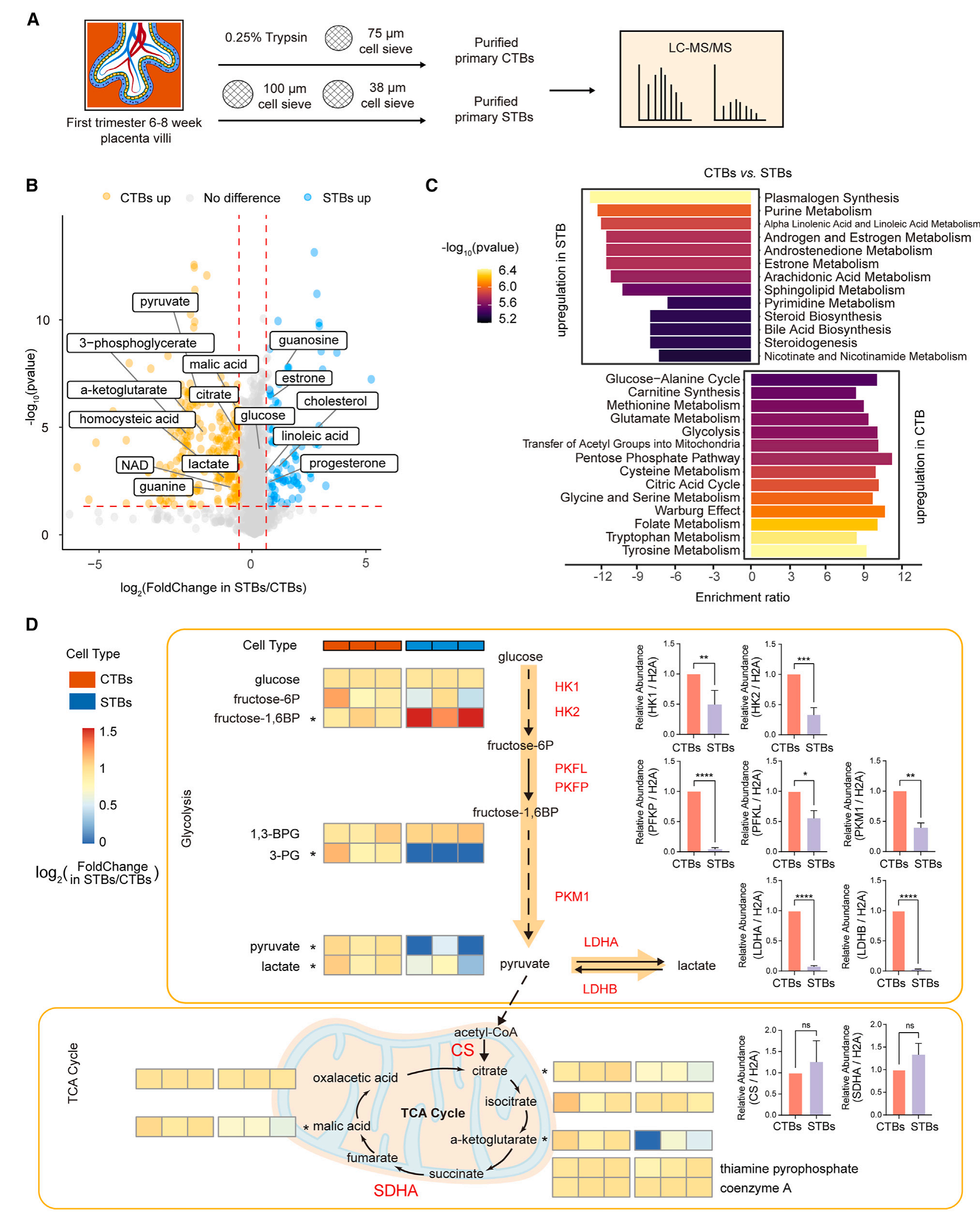 此外,將代謝組學(xué)結(jié)果與葡萄糖代謝的蛋白質(zhì)分析結(jié)果聯(lián)合分析(圖2D)。結(jié)果表明,CTBs和STBs代謝產(chǎn)物的變化與代謝酶蛋白的變化一致。CTBs的糖酵解代謝物、3-PG、丙酮酸和乳酸明顯高于STBs(圖2D)。CTBs中TCA循環(huán)中的檸檬酸、α-酮戊二酸和蘋(píng)果酸明顯高于STBs(圖2D)。相比之下,STBs體內(nèi)類(lèi)固醇激素代謝的相關(guān)關(guān)鍵代謝物較高,這與STBs合成激素的特點(diǎn)相一致。綜上所述,CTBs和STBs之間的代謝程序存在明顯差異。在高度增殖和未分化的CTBs中,葡萄糖代謝和氨基酸代謝更為活躍,而在有絲分裂后和分化的STBs中,脂肪酸代謝和類(lèi)固醇激素代謝更為活躍。