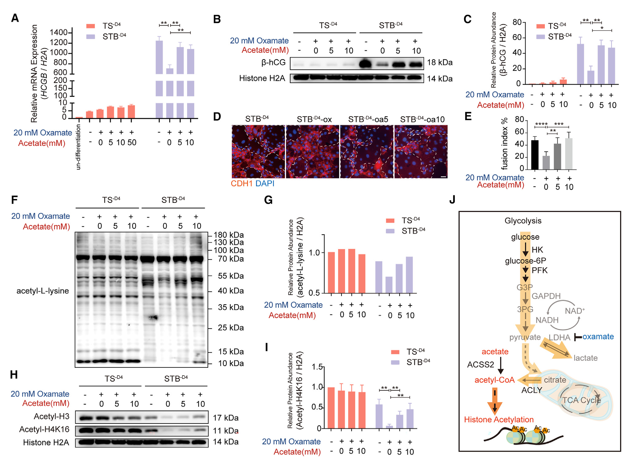 接下來(lái),該研究使用糖酵解的關(guān)鍵代謝物,包括葡萄糖、丙酮酸和醋酸酯(用于補(bǔ)充細(xì)胞內(nèi)乙酰輔酶A),來(lái)探索糖酵解代謝物對(duì)人滋養(yǎng)細(xì)胞合胞的影響。結(jié)果表明,隨著葡萄糖濃度的增加,從5到18 mM,STB-D4細(xì)胞中HCGB以及SDC1、ERVFRD1、ERVW1、GCM1、PSG4和CYP19A1的表達(dá)逐漸增強(qiáng),滋養(yǎng)細(xì)胞的合胞化程度逐漸增強(qiáng)(圖3D)。丙酮酸處理在未分化的hTSCs和正在合胞的hTSCs中導(dǎo)致了類(lèi)似的反應(yīng),即一定濃度范圍內(nèi)(10 mM)的代謝物增加了滋養(yǎng)細(xì)胞的合胞 (圖3E)。同樣,在一定濃度范圍內(nèi),乙酸也顯著促進(jìn)滋養(yǎng)細(xì)胞合胞(圖3F),在超高濃度下,HCGB、GCM1、PSG4和CYP19A1被顯著抑制(圖3)。特別指出,糖酵解藥物和中間體對(duì)HTSCs和STBs的合胞有特異性作用,但對(duì)未分化的htsc沒(méi)有特異性作用。因此,涉及STB特異性信號(hào)傳導(dǎo),并且調(diào)節(jié)滋養(yǎng)層合胞化可能需要較佳水平的基礎(chǔ)糖酵解物質(zhì)。