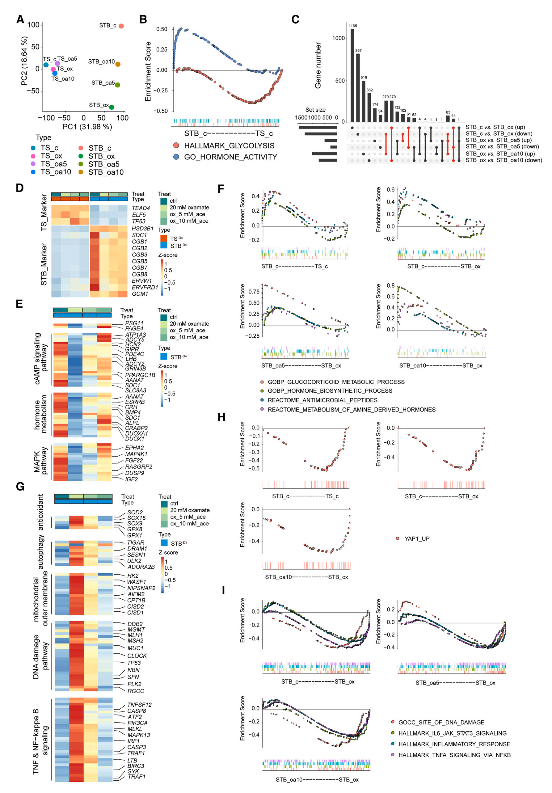 GSEA進(jìn)一步顯示,與STB_c相比,未分化的TS_c特異性地富集了hippop – yap /Taz-TEAD特征(圖5H)。這些結(jié)果表明,草酸阻斷了STB的合胞,而這種分化阻斷被乙酸修復(fù)。此外,與正常STB_c和經(jīng)草酸和乙酸(STB_oa5和STB_oa10)處理的STB-D4相比,涉及DNA損傷、白素-6 (IL-6)信號(hào)、炎癥反應(yīng)和TNF信號(hào)的四種GSEA特征均在STB_ox中特異性富集(圖5I)。