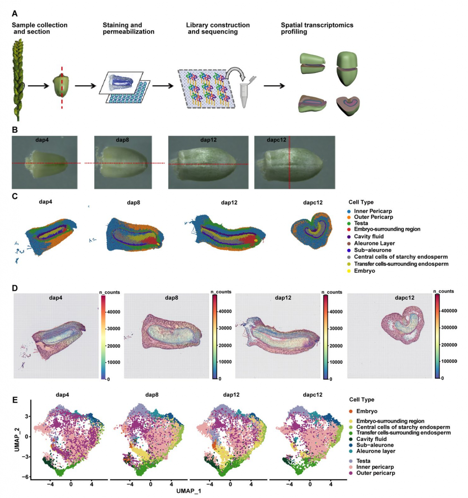 小麥(Triticum aestivum L.)是全球三大主糧作物之一,種植面積約2.3億公頃,其產(chǎn)量提升對保障全球糧食安全與營養(yǎng)供給至關重要。小麥籽粒主要由三部分組成:二倍體胚、三倍體胚乳及果皮(種皮)。這些組織在發(fā)育過程中表現(xiàn)出顯著的基因表達時空特異性,形成功能分化的區(qū)室化結構。盡管這些組織在細胞類型和生理功能上存在明顯差異,但它們通過協(xié)同調(diào)控構建了獨特的籽粒發(fā)育微環(huán)境,共同決定籽粒的最終表型。然而,目前對籽粒細胞類型的認知仍主要依賴于形態(tài)學觀察和少量標記基因的表達分析,常規(guī)轉(zhuǎn)錄組數(shù)據(jù)因缺乏空間分辨率,極大限制了對籽粒發(fā)育調(diào)控機制的深入解析及關鍵功能基因的挖掘。