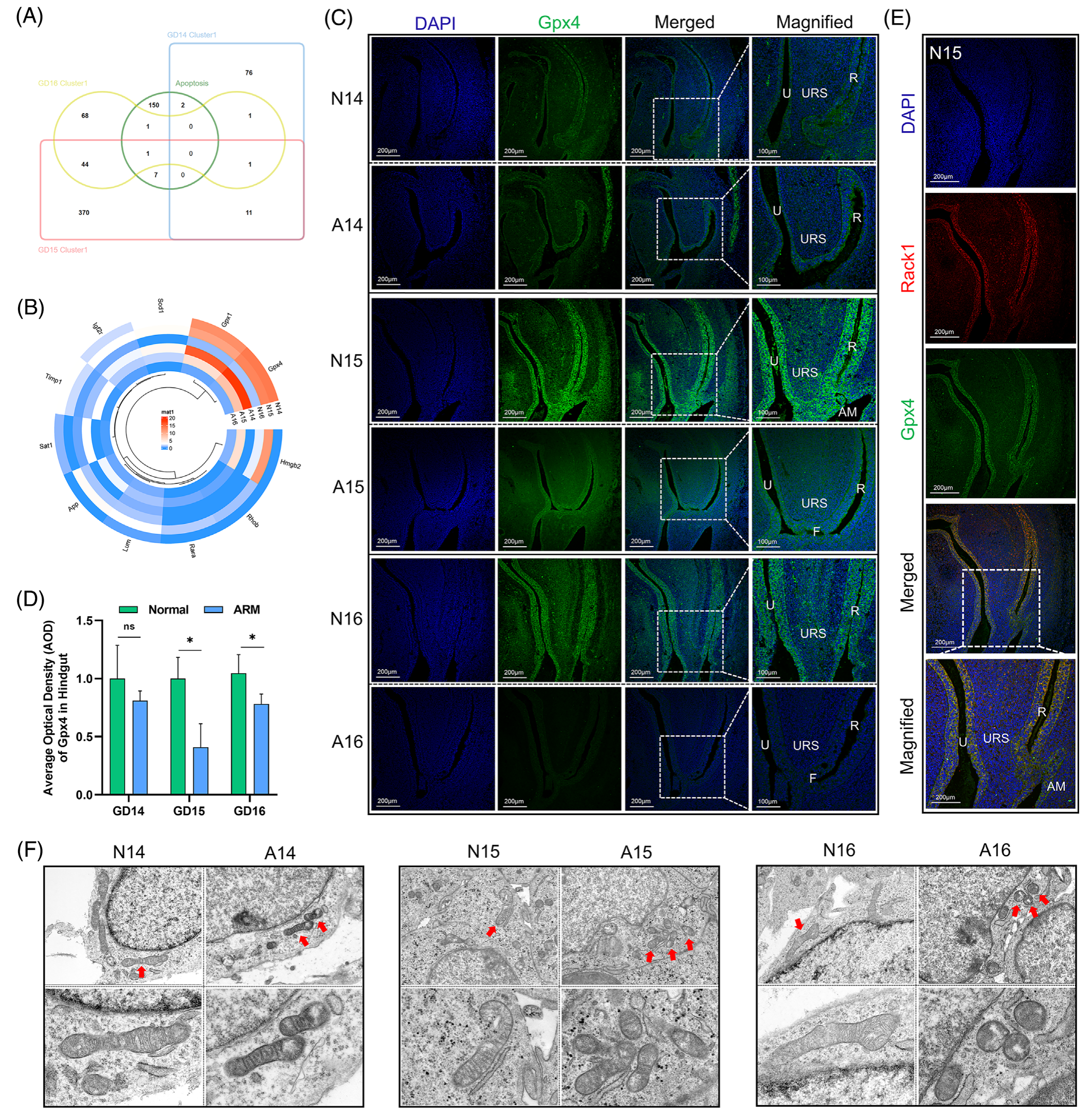 在基因集富集分析(GSEA)數(shù)據(jù)庫中,細胞死亡基因集包含161個基因,其中 7 個細胞死亡相關(guān)基因是從基因集與GD 15上簇1中的 DEGs 交集中獲得的(圖 4A)。圓形熱圖顯示了與聚類1的6個樣本相同區(qū)域內(nèi)的細胞死亡基因的表達譜。值得注意的是,發(fā)現(xiàn)谷胱甘肽過氧化物酶家族的關(guān)鍵成員?Gpx4?在 GD 15 的簇 1 中下調(diào)(p < 0.05;圖 4B)。免疫熒光染色顯示 Gpx4 蛋白在尿道和后腸上皮以及 AM 區(qū)域的顯著定位,在 URS 中觀察到的分布相對較淺。在 ARM 組的泄殖腔中觀察到 Gpx4 陽性信號的減少(圖 4C)。AOD 分析表明,在 GDs 15 和 16 上,后腸中 Gpx4 表達在統(tǒng)計學(xué)上顯著降低(p < 0.05;圖 4D)。