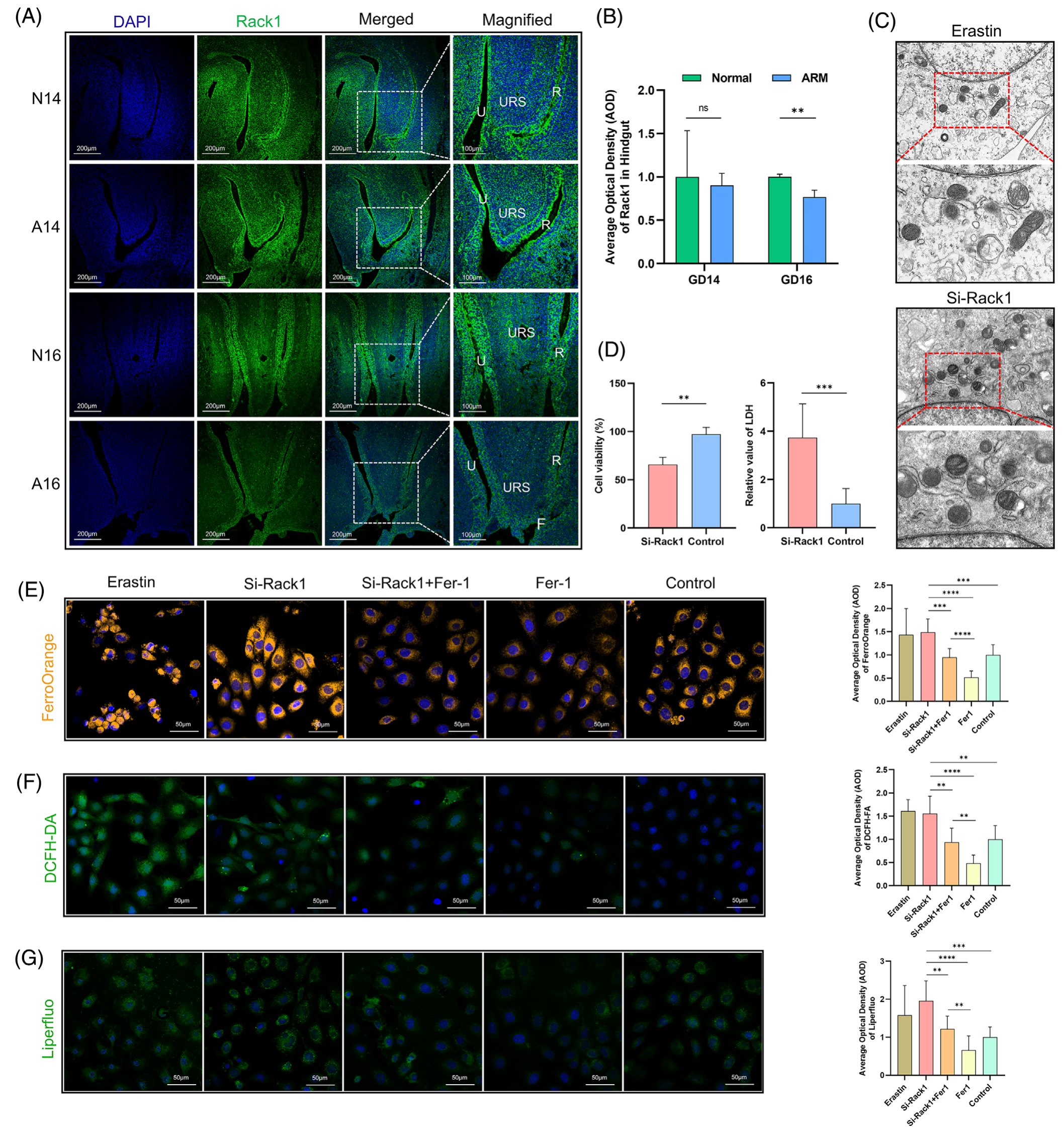 N15 胚胎石蠟切片的雙免疫熒光染色顯示 Rack1 和 Gpx4 蛋白在尿道和后腸上皮內(nèi)共定位。該結(jié)果表明 Rack1 在調(diào)節(jié)這些組織中的鐵死亡中的潛在作用 (圖 4E)。隨后,進行顯微解剖以獲得正常和 ARM 胚胎的后腸組織。透射電子顯微鏡 (TEM) 顯示 ARM 組細胞線粒體體積減小,線粒體密度增加,線粒體嵴減少。這些觀察結(jié)果與與鐵死亡發(fā)生相關(guān)的線粒體形態(tài)變化一致(圖 4F)。