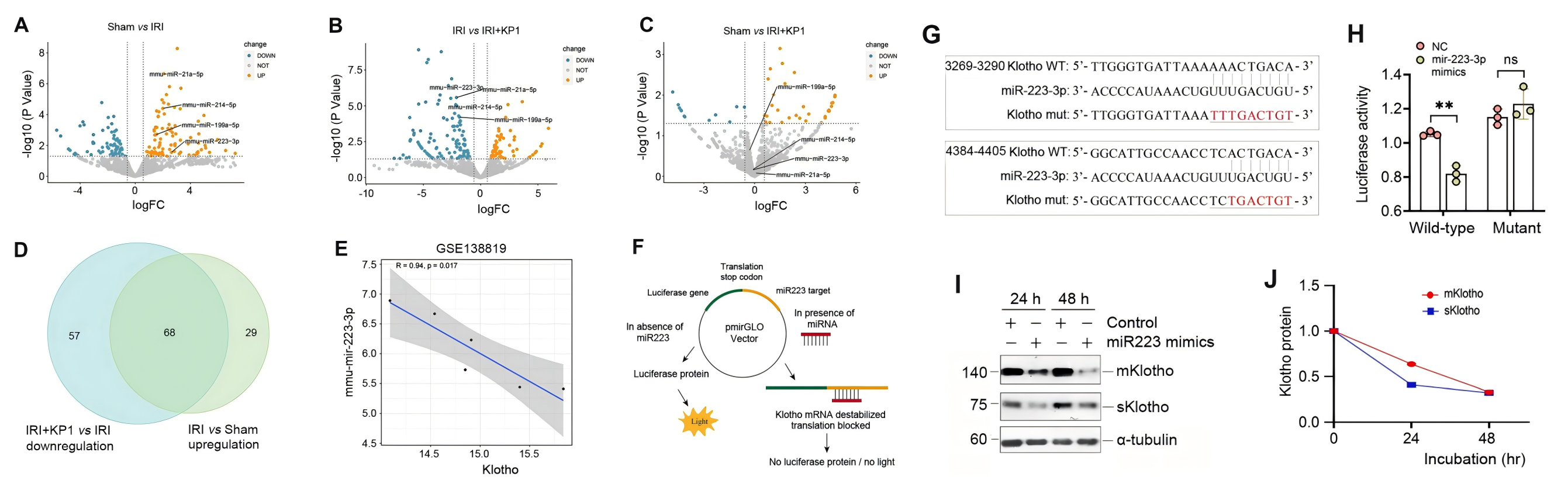 由于 KP1 不影響 Klotho mRNA 水平和蛋白質(zhì)穩(wěn)定性,作者開始探索 KP1 是否通過miRNA調(diào)節(jié) Klotho 蛋白,在 UIRI 腎臟中鑒定到了68個上調(diào)miRNA,在注射 KP1 后恢復(fù)到基線,其中 10 個與 Klotho mRNA 的 3′-UTR 特異性結(jié)合,其中miR-223-3p表現(xiàn)非常明顯,且在對公共轉(zhuǎn)錄組數(shù)據(jù)集分析后發(fā)現(xiàn),miR-223-3p 與 Klotho 水平呈負相關(guān),支持了 miR-223-3p 與 Klotho 調(diào)節(jié)的相關(guān)性。