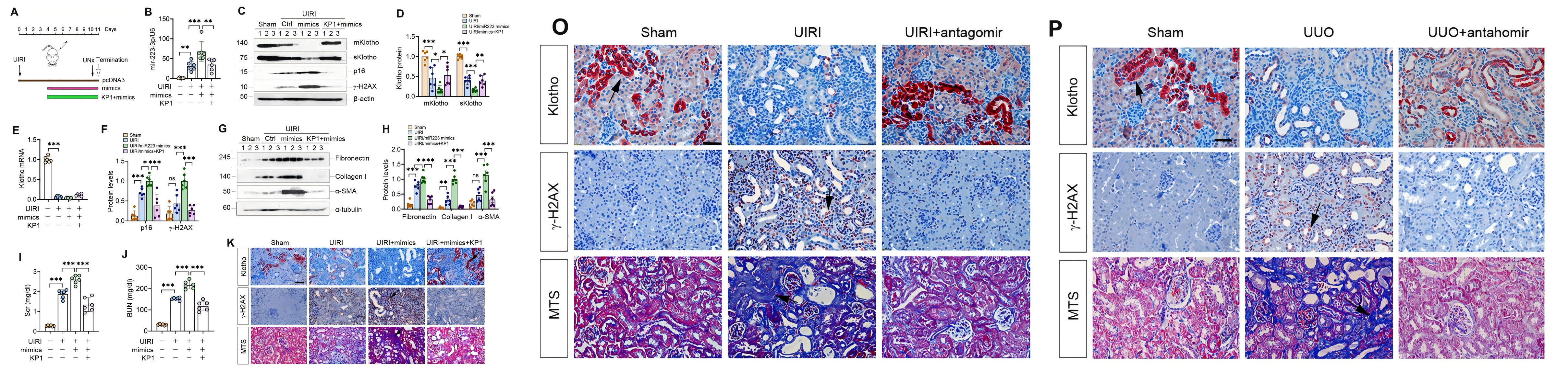 為了進一步驗證實驗結(jié)果,作者對小鼠模型靜脈注釋miR-223-3p 表達質(zhì)粒和 KP1構(gòu)建體內(nèi)表達模型,結(jié)果顯示,miR-223-3p 的過表達加劇了 p16 、 γ-H2AX 、纖連蛋白、 I 型膠原和 α-SMA 的表達,所有這些都被 KP1 抑制,而miR-223-3p拮抗素的注射同樣消除了 UIRI 小鼠中的 p21、p16 和 γ-H2AX、纖連蛋白、膠原蛋白 I 和 α-SMA,恢復(fù)了腎功能。而 KP1、SB431542 (TβR1/2 抑制劑) 和 SIS3 (p-Smad3 抑制劑) 處理 TGF-β1 刺激的 HK-2 細胞結(jié)果進一步闡明了,KP1 通過阻斷 TGF-β1/Smad3/miR-223-3p 信號傳導(dǎo)來恢復(fù) Klotho 表達并防止細胞衰老。