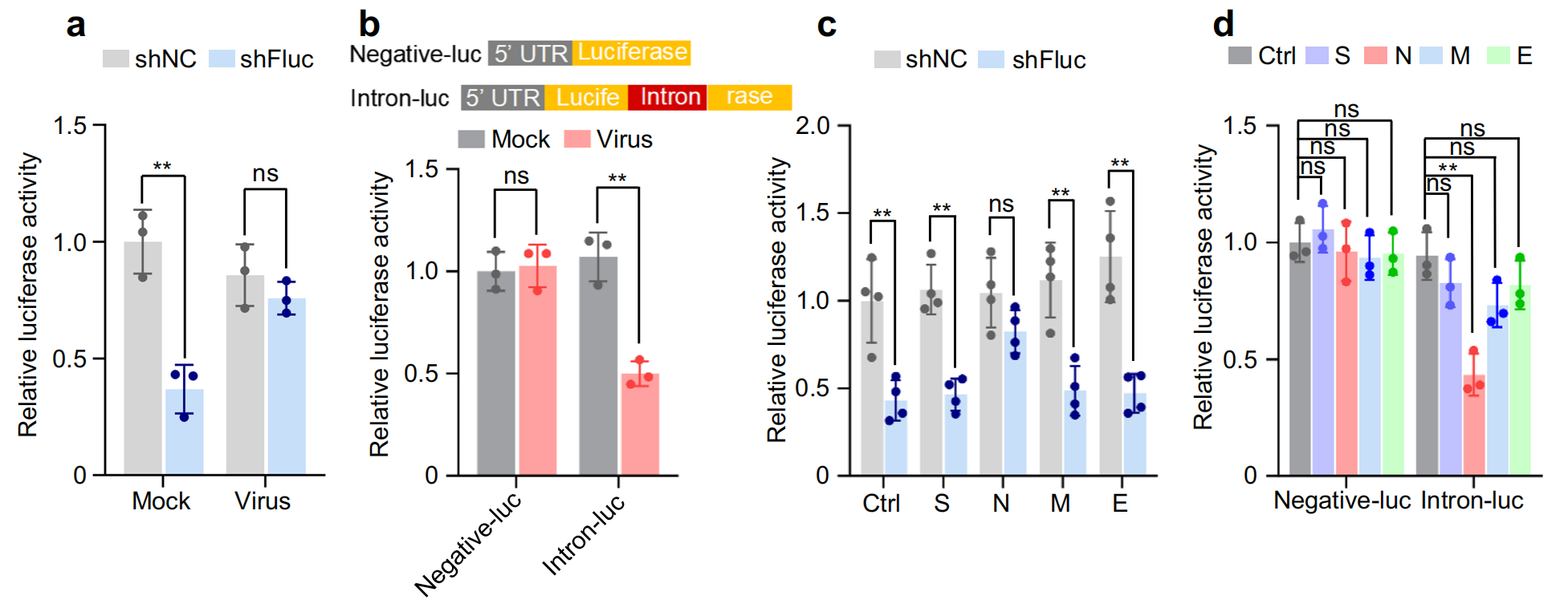 本研究通過數(shù)據(jù)庫檢索及分子實驗驗證先初步推測SARS-CoV-2 N蛋白的年齡依賴調(diào)控機制與RNAi以及可變剪接相關(guān),之后通過組學(xué)測序在整體水平上驗證了猜測并進一步細化了調(diào)控方式,之后再通過大量過表達及敲降后對應(yīng)分子在RNA及蛋白水平的定量驗證了結(jié)果,是一個比較經(jīng)典有效的實驗思路,可以在其他實驗中參考。
